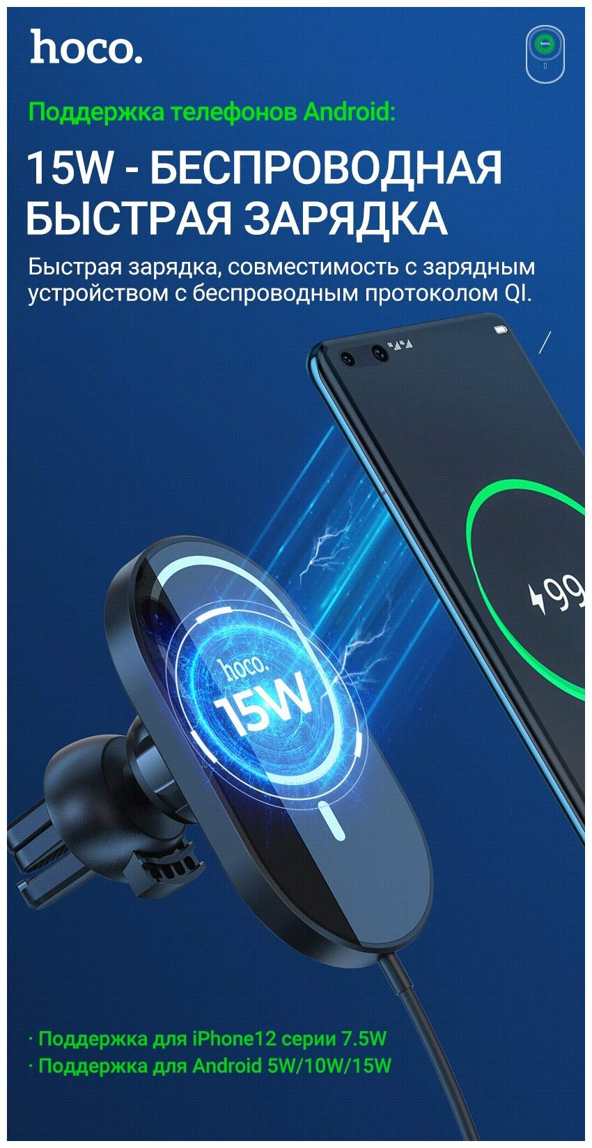 Автодержатель для iPhone 12 Series в дефлектор с беспроводной быстрой зарядкой 15W Hoco CA90 Powerful Черный