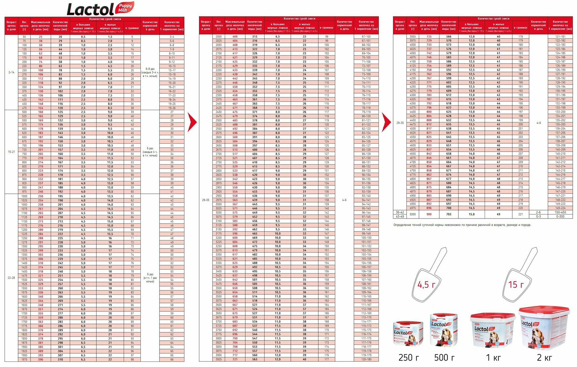 | Дозировка | 2 мерных ложки (30 г) без горочки (в одной ложке ~15 г) на каждые 100 мл теплой воды; определение точной суточной нормы невозможно по причине различий в возрасте, размере и породе; наиболее эффективным является кормление по требованию |