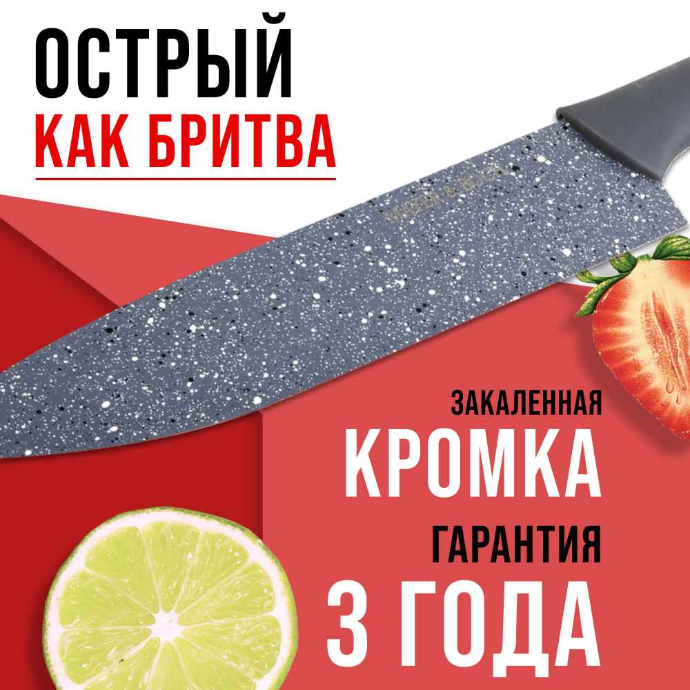 | Типы ножей в наборе | нож для овощей, универсальный нож, нож для хлеба, разделочный нож, шеф-нож |