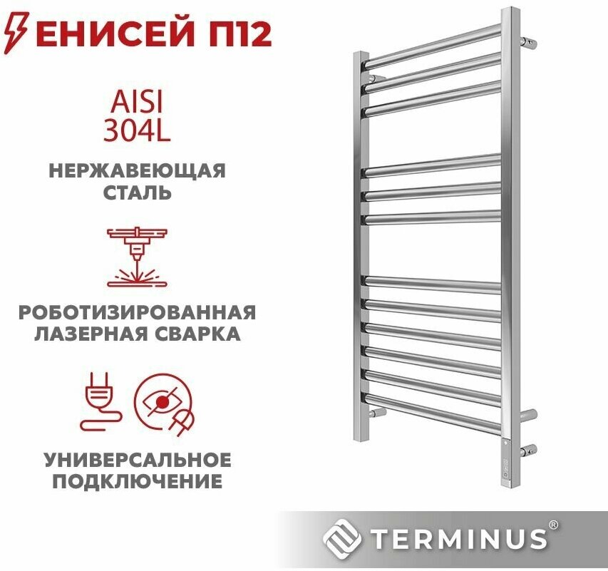 Полотенцесушитель электрический с таймером TERMINUS (Терминус) Енисей П12 500х1000мм, межосевое расстояние 500мм, высота 1000мм, сверхпрочная пищевая нержавеющая сталь, сенсорный диммер 5-ого поколения Quick Touch, 3 температурных режима
