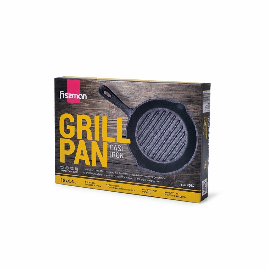 4067 FISSMAN Сковорода-гриль 18x4,4см (чугун) Ручка-чугун; Рифленое дно; Со сливом; Индукция