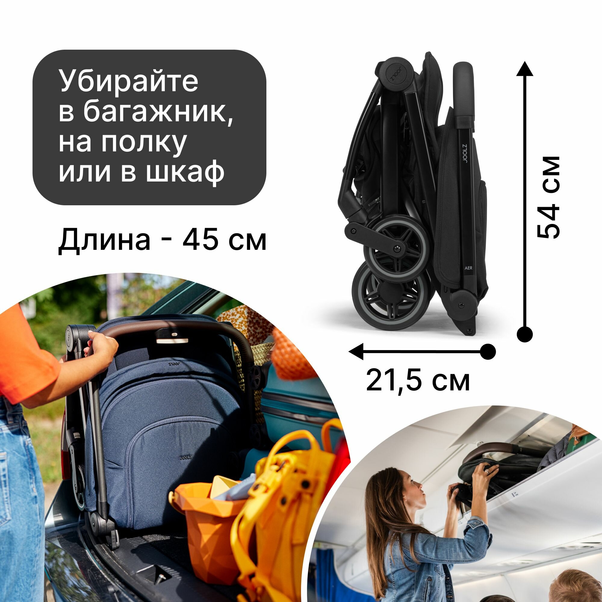 Я прекрасно справляюсь держа одной рукой дочку, второй раскладываю коляску. Joolz aer - это однозначно коляска для мобильных мам и маленьких машин, у нас мини Купер и внимание!!!! коляска занимает меньше половины багажника! |