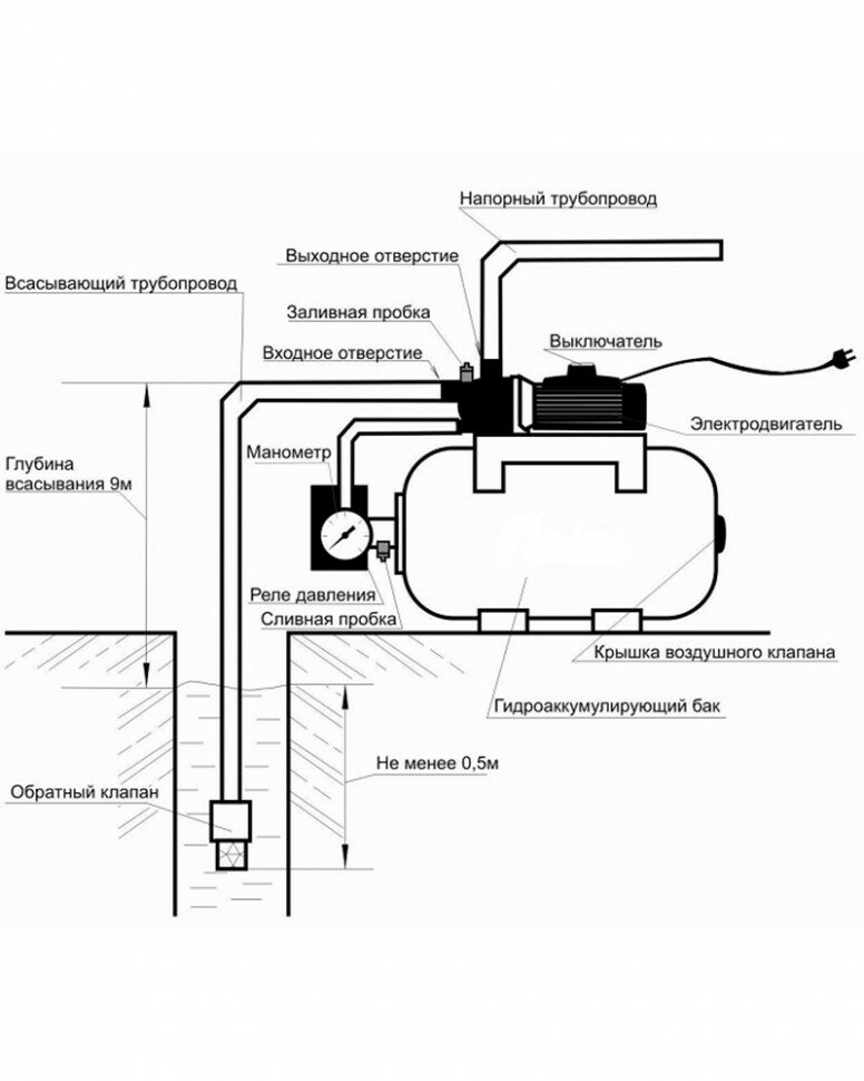 Автономная станция водоснабжения для дома и дачи АСВ-600/20Н Вихрь ( 600 Вт, напор 35 м, 55 л/мин, гидроаккумулятор 20 л, глубина всасывания 9 м)
