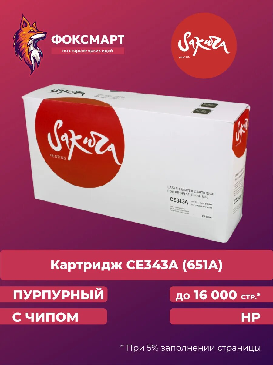 Картридж CE343A (651A) для HP, лазерный, пурпурный, 16000 страниц, Sakura