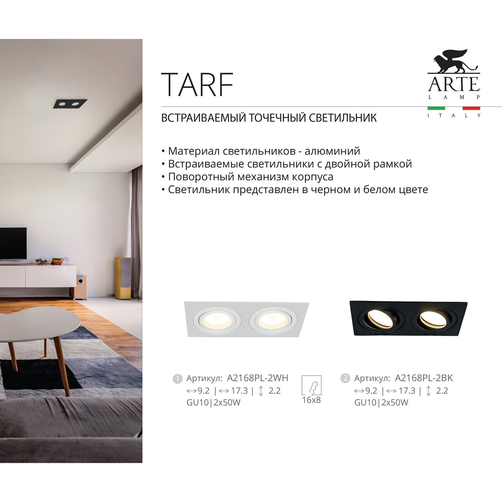 Встраиваемый светильник Arte Lamp A2168PL-2BK TARF под лампы 2xGU10 50W