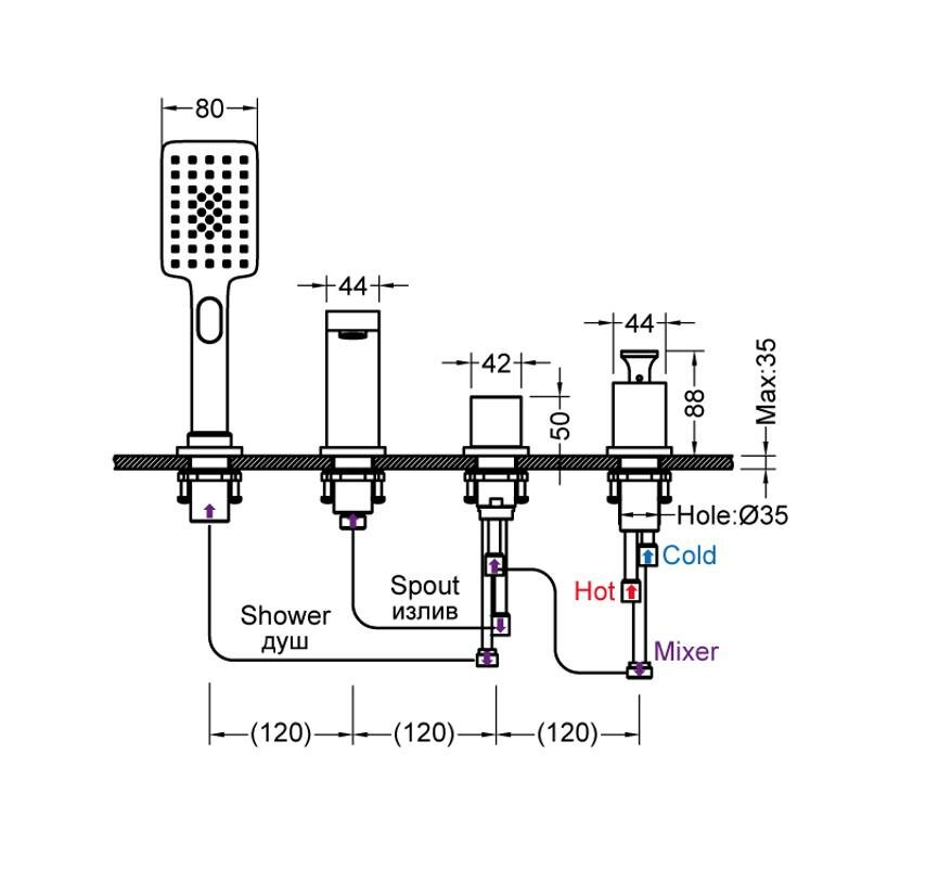 | Комплектация | Смеситель врезной - 1 шт. Излив врезной (латунный) - 1 шт. Блок управления режимами, врезной - 1 шт. Держатель ручной лейки, врезной - 1 шт. Ручная лейка (пластик) - 1 шт. Шланг душа 1,5 м - 1 шт. Инструкция - 1 шт. |