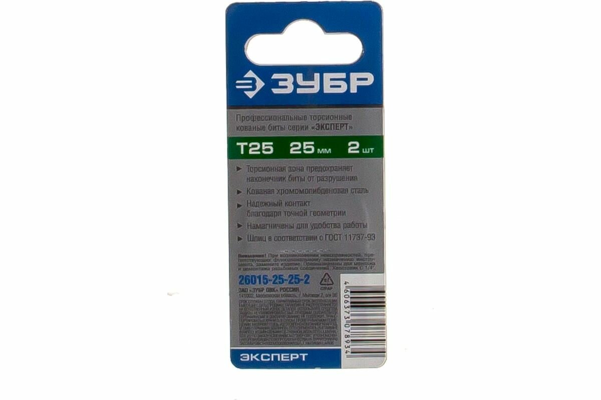 Биты ЗУБР эксперт торсионные кованые, обточенные, хромомолибденовая сталь, тип хвостовика C 1/4, T25, 25мм, 2шт