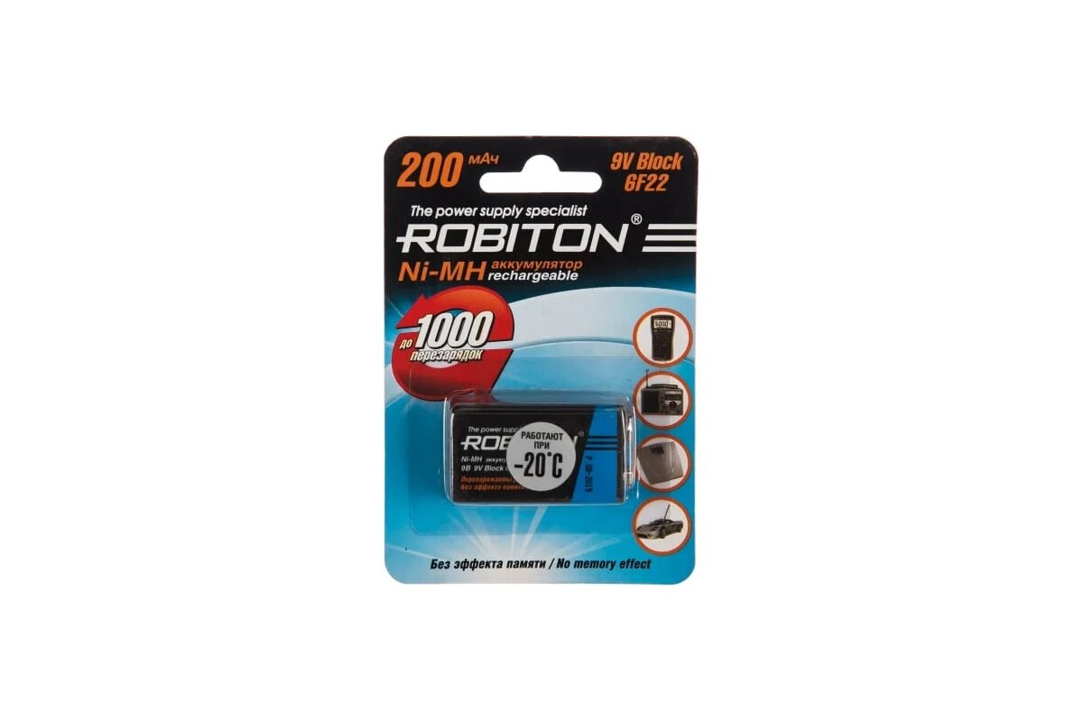 Ni-Mh аккумулятор ROBITON 200MH9 SR-1 13562, 9В, 200мАч, размер Крона, металлогидридный, 1шт в упаковке