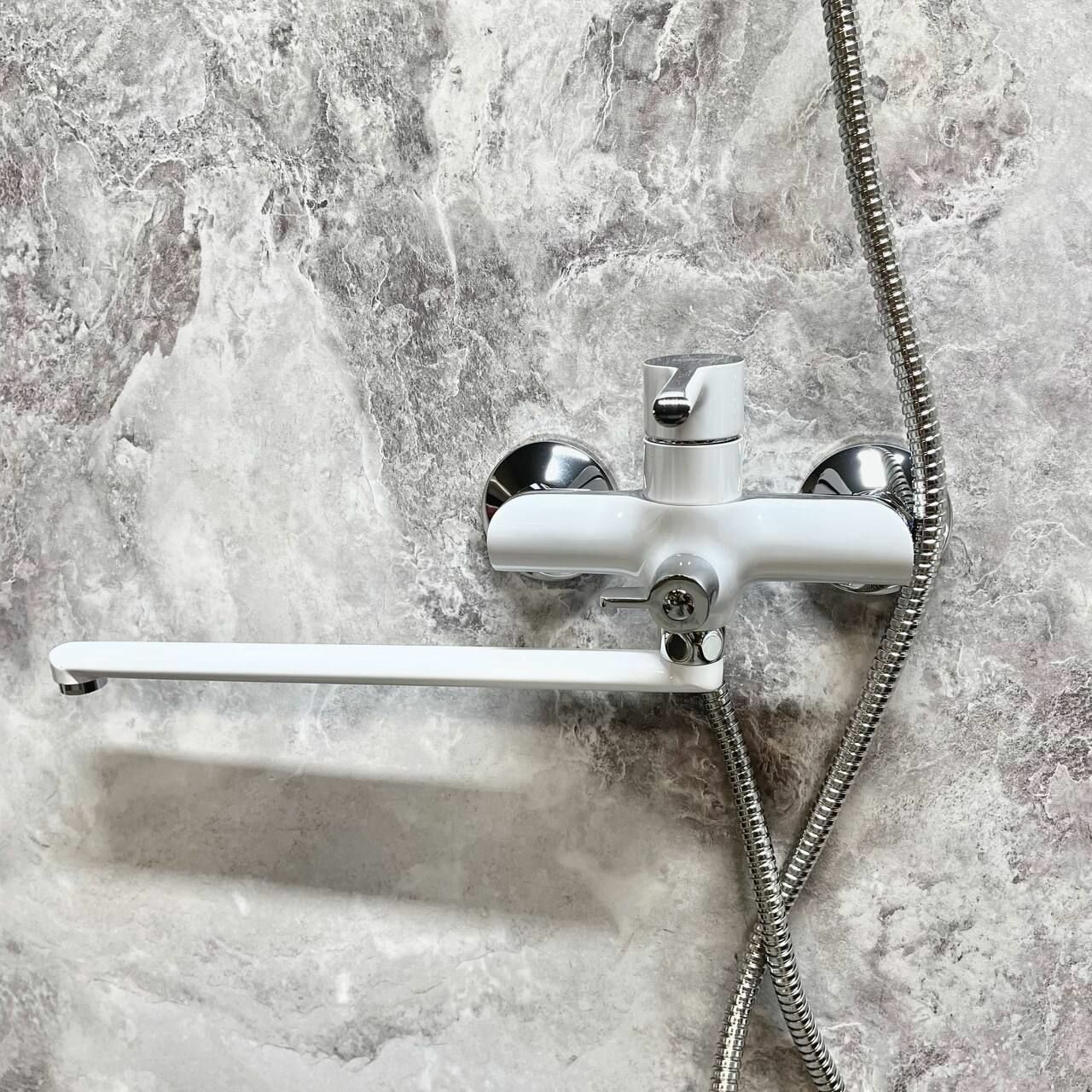 Смеситель для ванны с душем Haiba HB22805-8 с длинным изливом, лейкой и шлангом и переключателем в корпусе белый