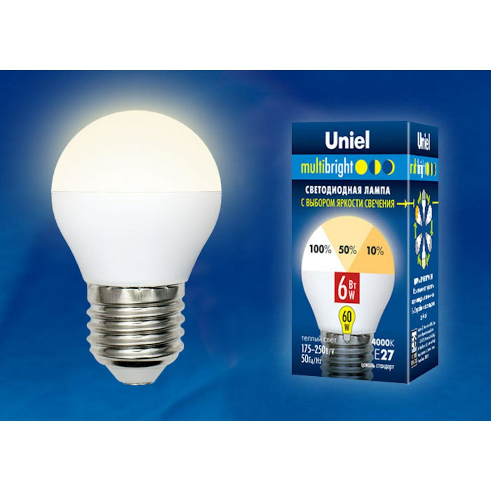 Uniel LED-G45-6W/WW/E27/FR/MB PLM11WH Лампа светодиодная. Форма «шар», матовая. Серия Multibright. Теплый белый свет (3000K). 100-50-10. Картон. ТМ Uniel.