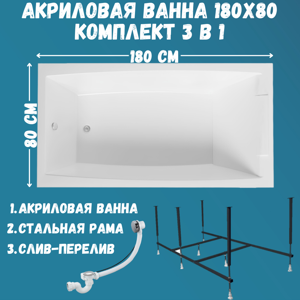 Ванна акриловая 180х80 см AELITA комплект 3в1: Прямоугольная ванна, металлический каркас, слив-перелив 01ае1880кс2+