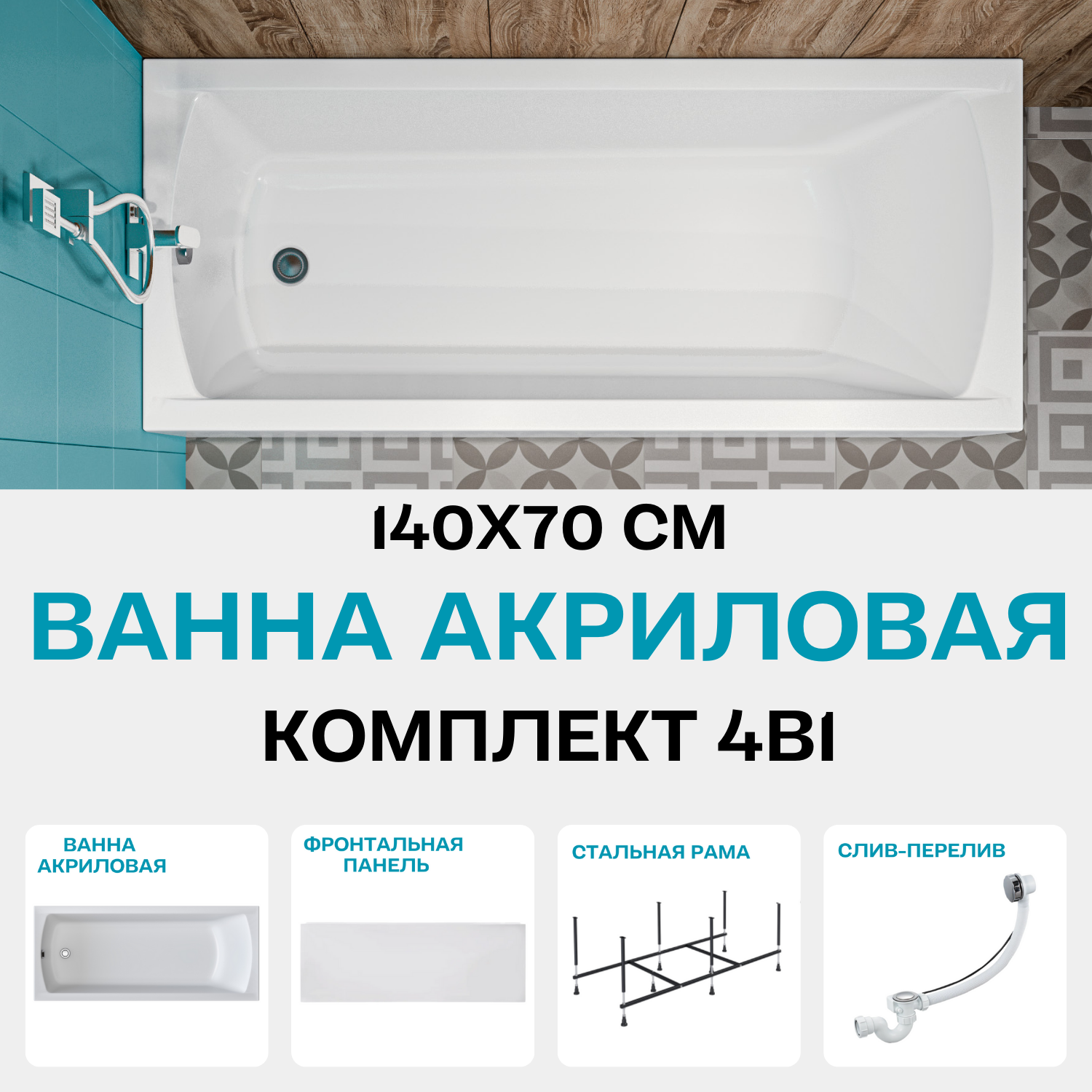 Купить Ванна акриловая 140х70 см 1MARKA MODERN в наборе 4 в 1: Прямоугольная ванна, фронтальная панель, усиленный металлический каркас, слив-перелив хром 01мод1470кп