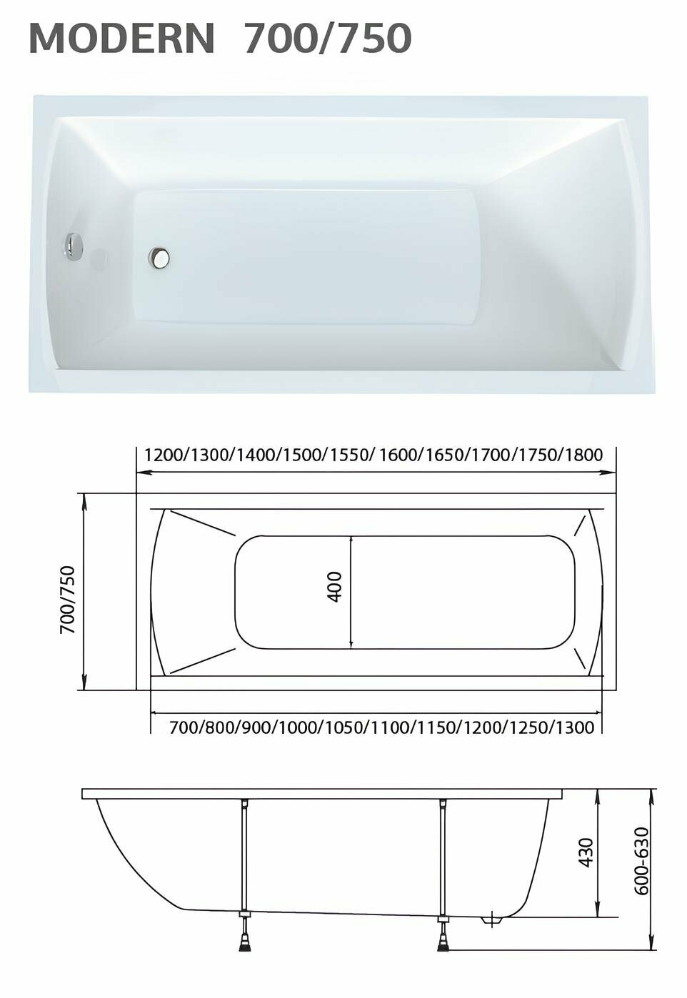 Ванна акриловая 170х70 см MODERN комплект 4в1: Прямоугольная ванна, фронтальная панель, рама, слив-перелив 01мод1770кп