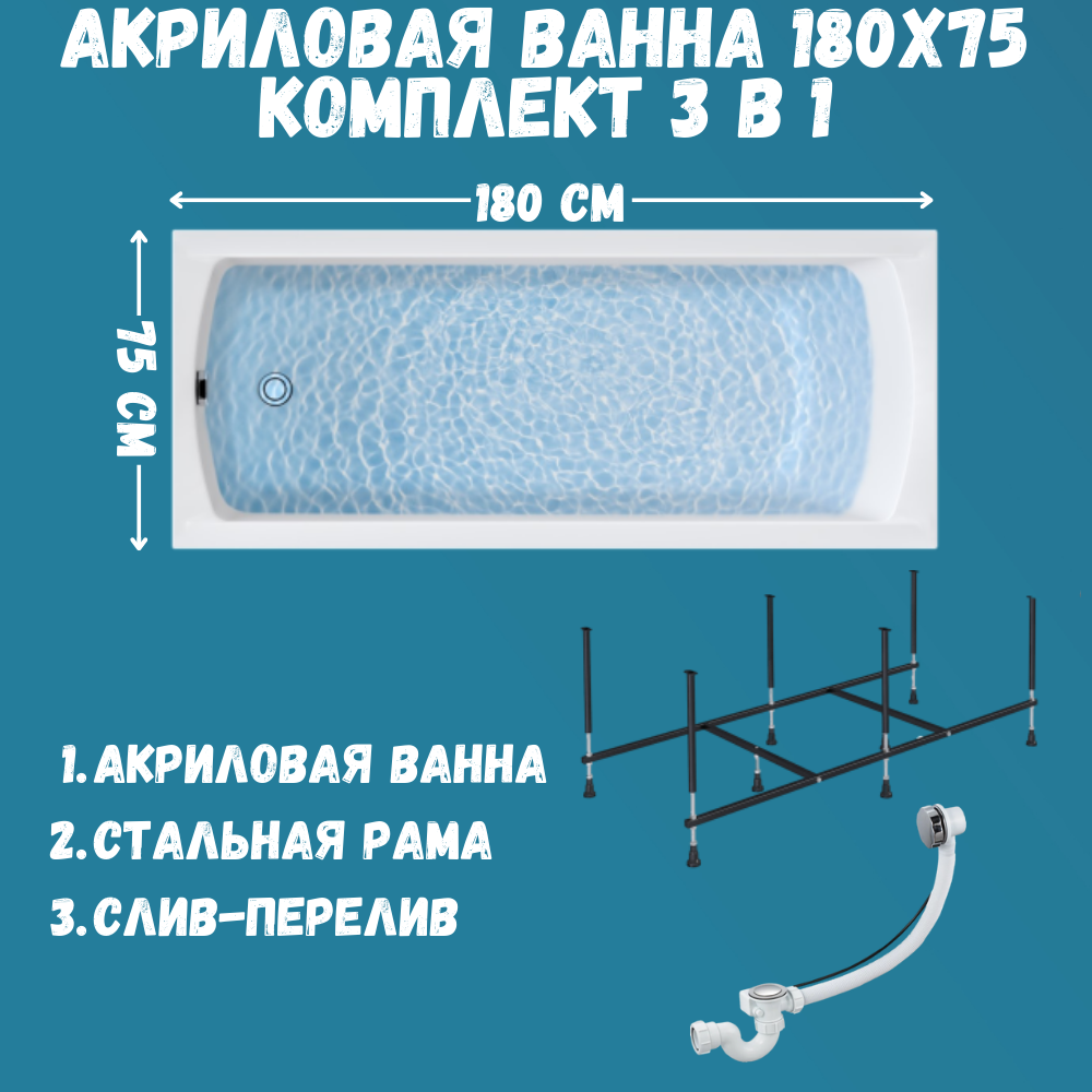 СохранитьВанна акриловая 180х75 см 1MARKA MODERN в наборе 3 в 1: Прямоугольная ванна, усиленный металлический каркас, слив-перелив хром 01мод1875кс2+ интересное: