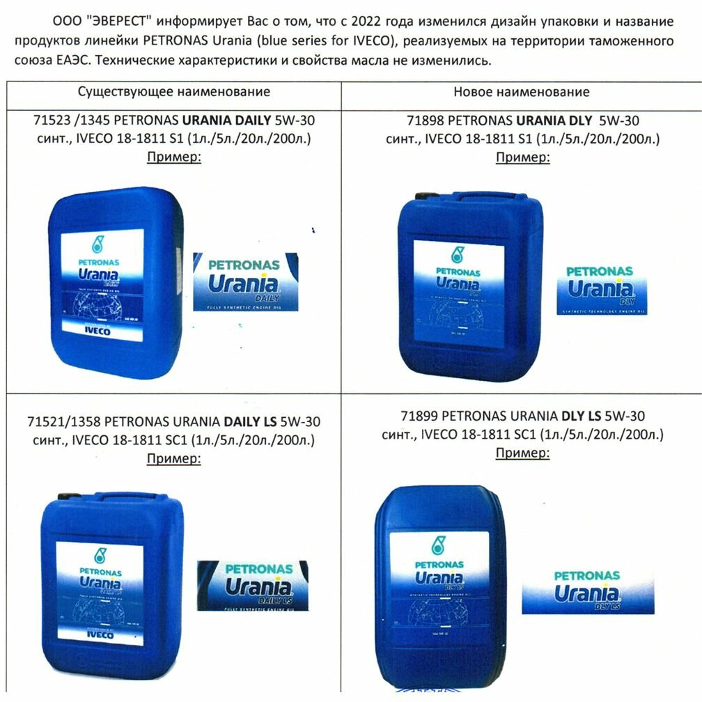 Petronas Моторное маслоURANIA DLY 5W30, синт. 5л.,IVECO 18-1811 S1, шт 71898M12TR