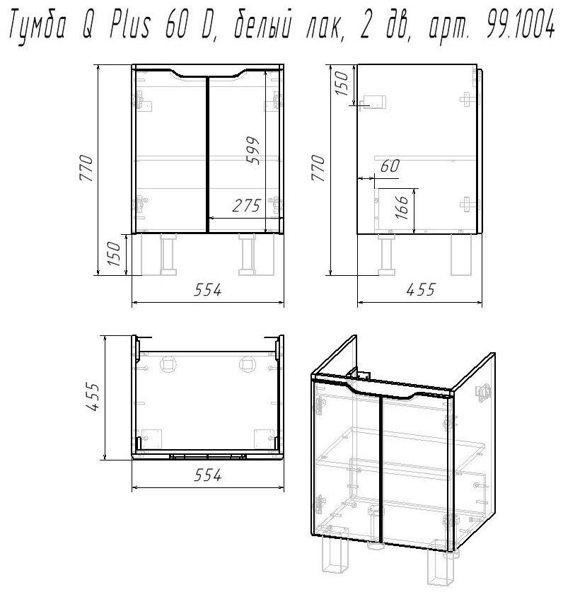 СохранитьТумба Dreja Q Plus (D) 60, 99.1004, подвесная/напольная, 2 дверцы, с опорами, белый глянец интересное: