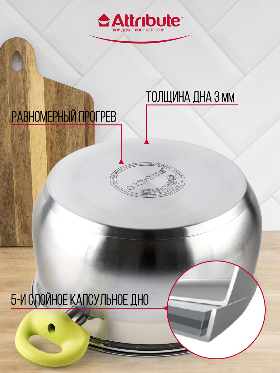 Кастрюля с крышкой GLORY 20х11.5см 3.5л,ATTRIBUTE STEEL, для всех видов плит, для индукции интересное: