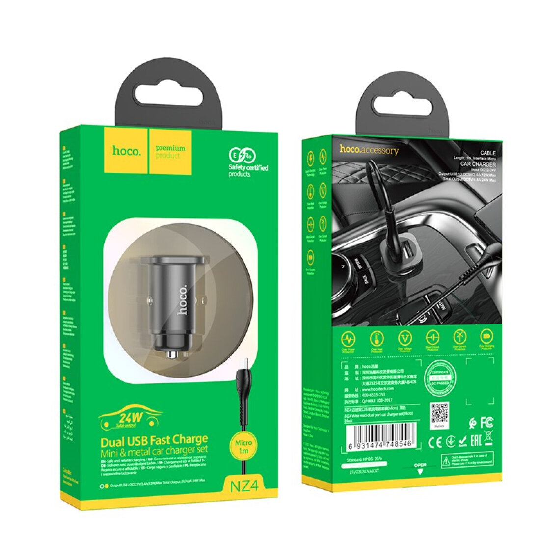 Автомобильное зарядное устройство HOCO NZ4 Wise, 2*USB + Кабель USB-Micro, 2.4A, черный