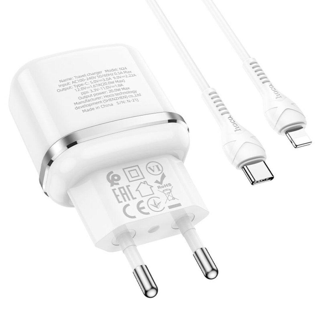 HOCO N24 Victorious singl port PD20W Charger set (Type-c to iphone) (EU) white
