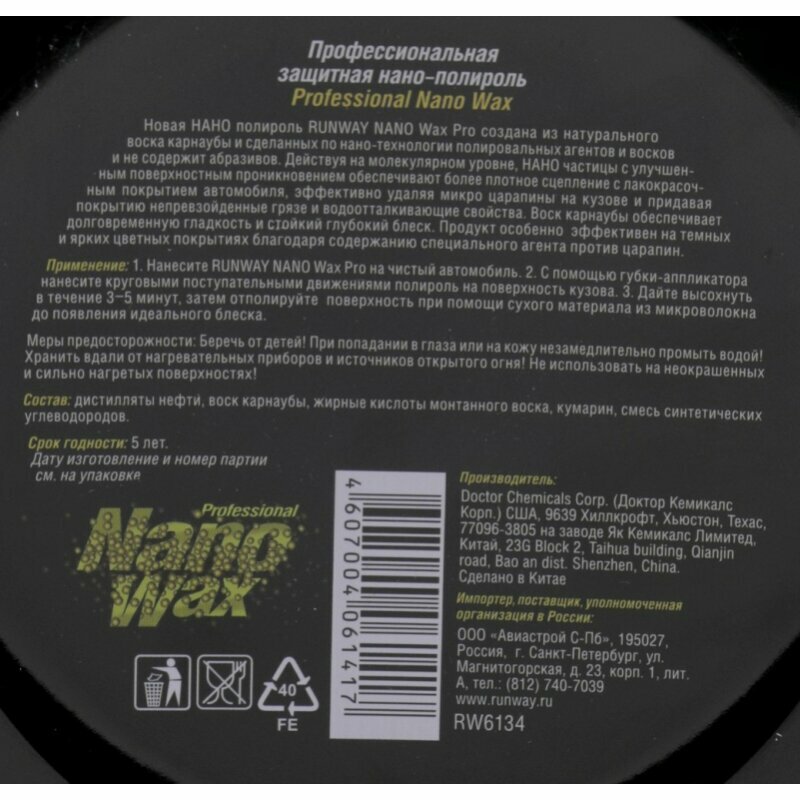 Защитное покрытие-полироль кузова Runway Professional Nano Wax, с воском карнауба, с водоотталкивающим эффектом, банка 300мл, (+губка), арт. RW6134