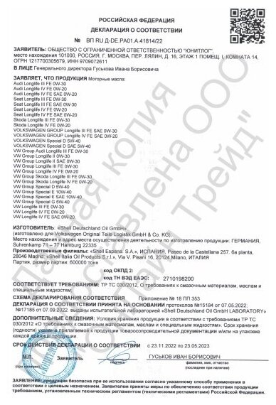 | Допуски OEM | VW 502.00/505.00 / VW 502.00 |