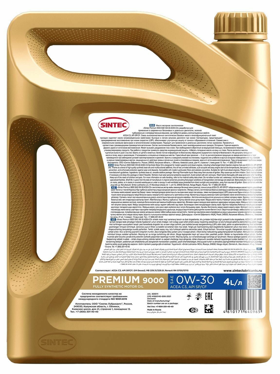 SINTEC 600111 Sintec Premium 9000 0W30 (4L) масло моторное! синт.\ API SP/CF, ACEA C3, MB 229.31/229.51, GM Dexos2
