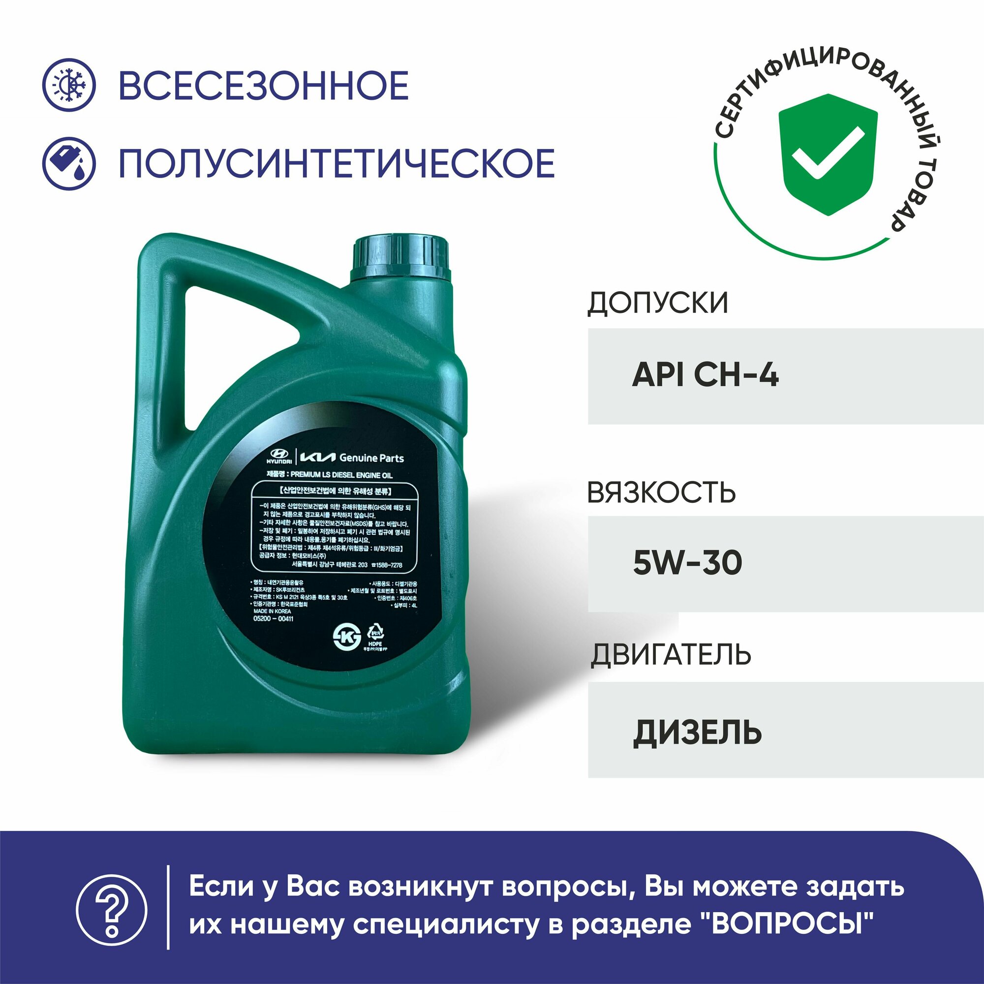 HYUNDAI MOBIS Моторное масло HYUNDAI Premium LS Diesel SAE 5W-30 CH-4 (1л) арт. 0520000111 Оригинальный товар!