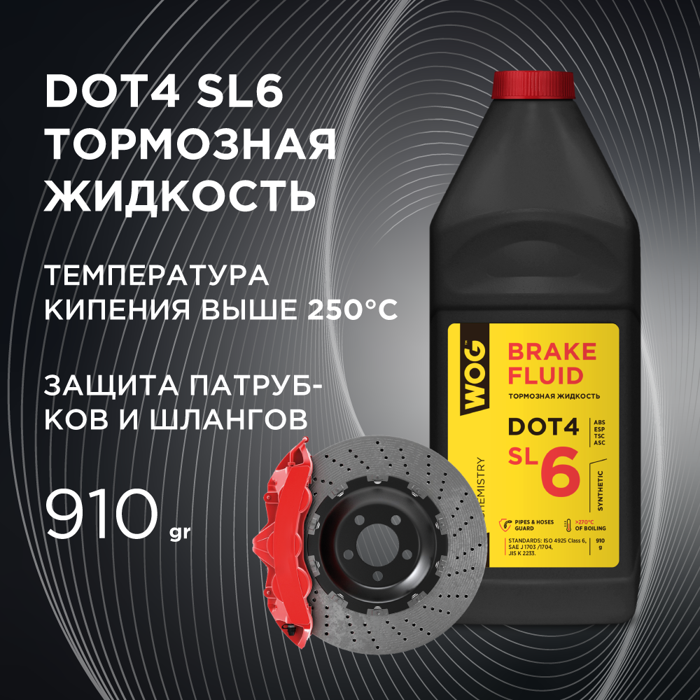 WOG WGC0143 Жидкость тормозная 910гр - DOT 4 SL6, синтетическая для авто с ABS, ESP, TSC и ASC, соответствует: ISO 4925 Class 6, SAE J 1703/1704, JIS K 2233