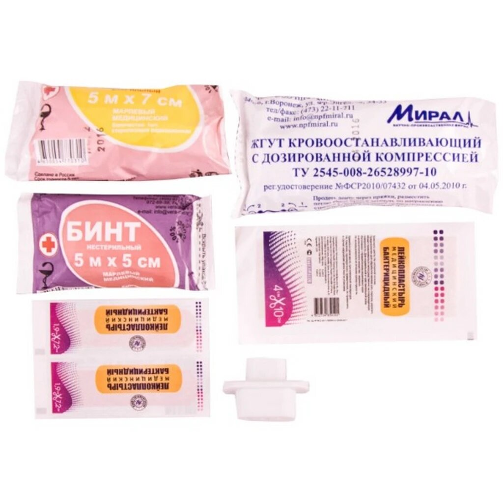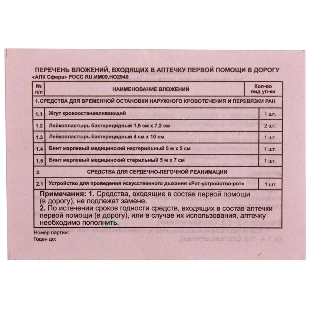 | Состав | кровоостанавливающий жгут с дозированной компрессией - 1 шт, нестерильный бинт - 1 шт, стерильный бинт - 1 шт, клейкий бактерицидный пластырь 100*40 мм - 1 шт, клейкий бактерицидный пластырь 79*19 мм - 1 шт, устройство для проведения искусcтвенного дыхания" рот-устройство -рот - 1 шт, рекомендация по применению автомобильной аптечки и ее содержимого - 1 шт |