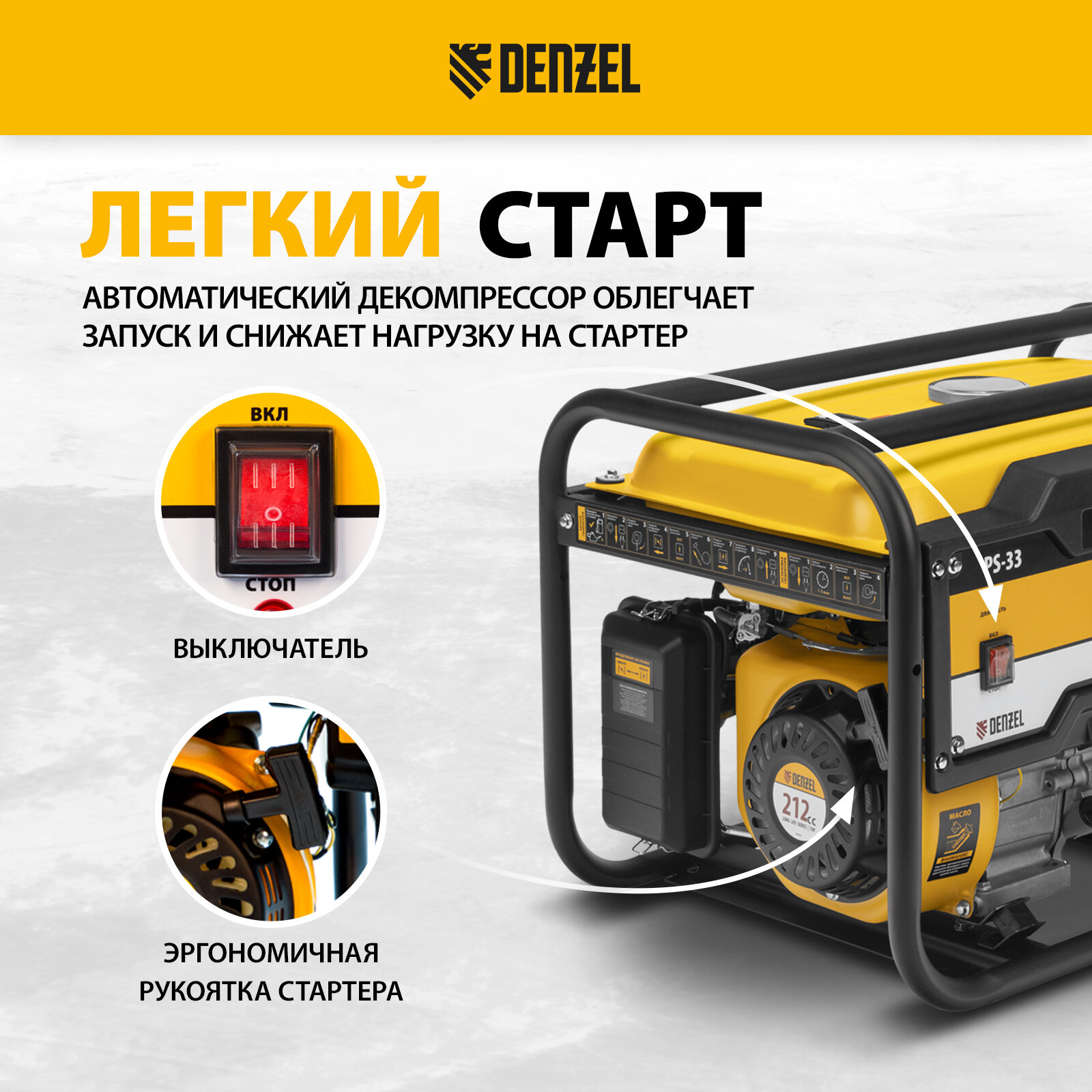 Генератор бензиновый PS 33, 3.3 кВт, 230 В, 15 л, ручной стартер Denzel Denzel