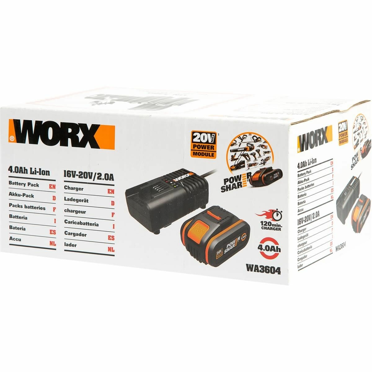 Комплект WORX WA3604: аккумулятор 4 А*ч, 20 В и зарядное устройство 2 А, 20 В, коробка