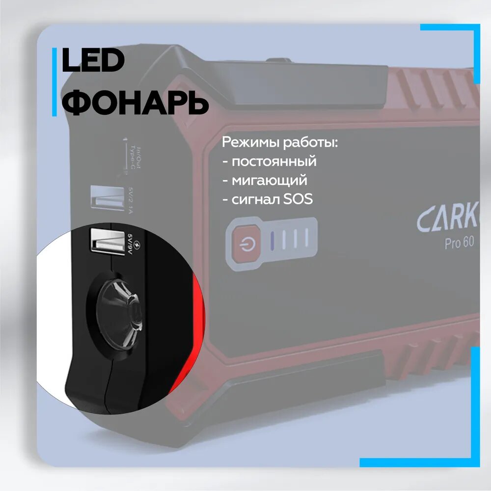 Пусковое зарядное устройство для автомобиля CARKU PRO-60 ПЗУ+ Power Bank LED фонарь, с быстрой зарядкой (Quick Charge), 25000 мАч интересное:
