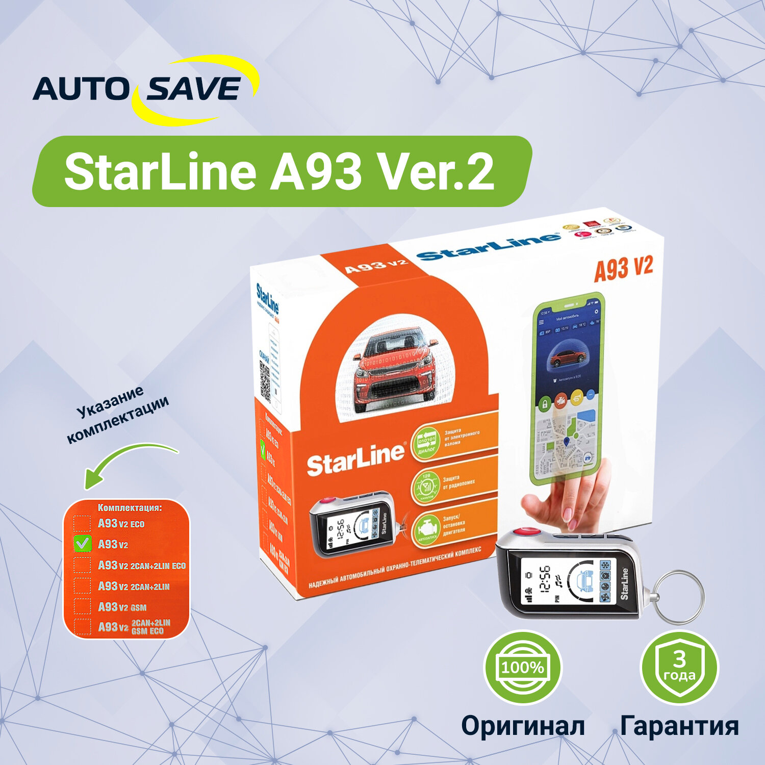 Автосигнализация StarLine A93 ECO Ver.2 с автозапуском в комплекте 1 брелок