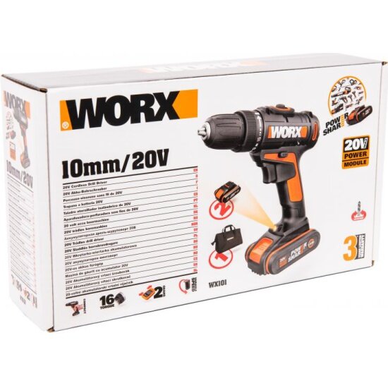 Дрель-шуруповерт аккумуляторная Worx WX101 20В, 1.5Ач x2 коробка WX101