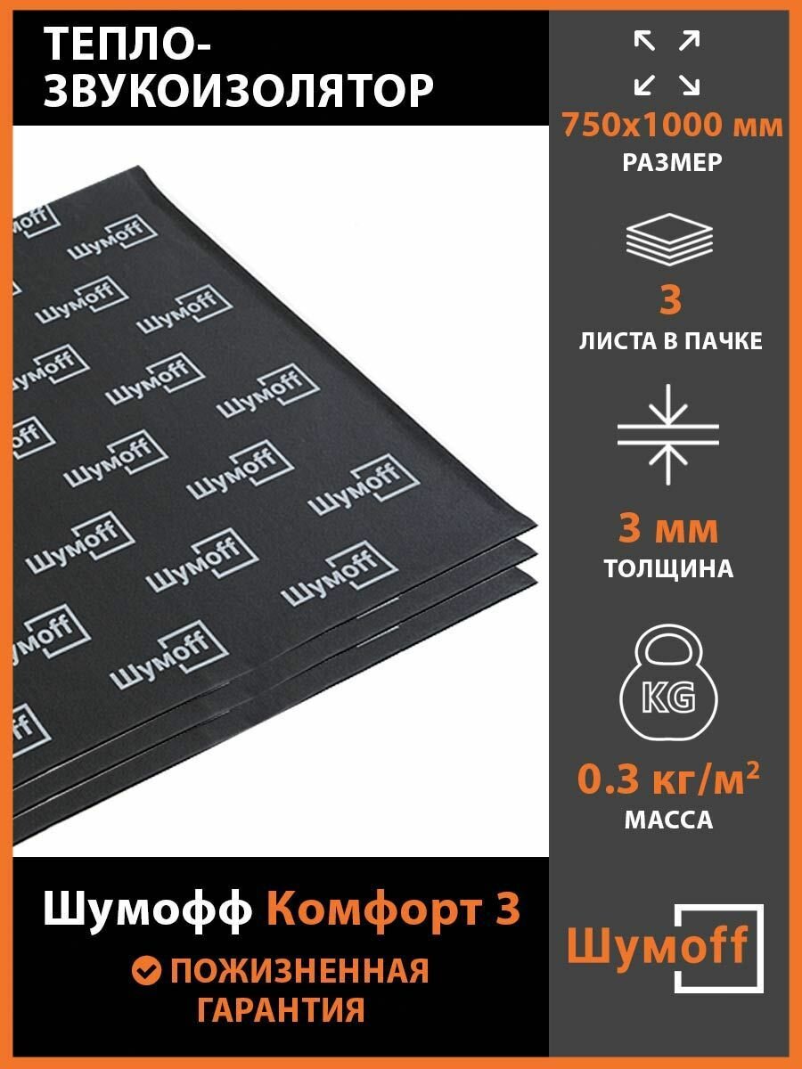 Шумофф Комфорт 3 - 3 листа 75х100 см водостойкая звукоизоляция для автомобиля