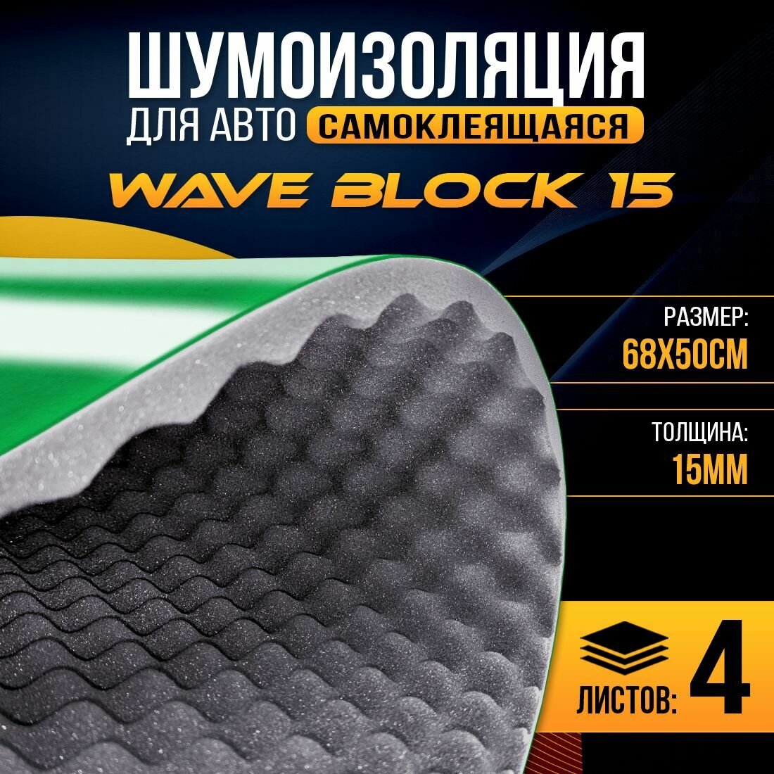 Шумоизоляция для авто DreamCar Волна Блок 15, 2 листа 68*50 см, акустический поролон на мастичном слое, Wave Block