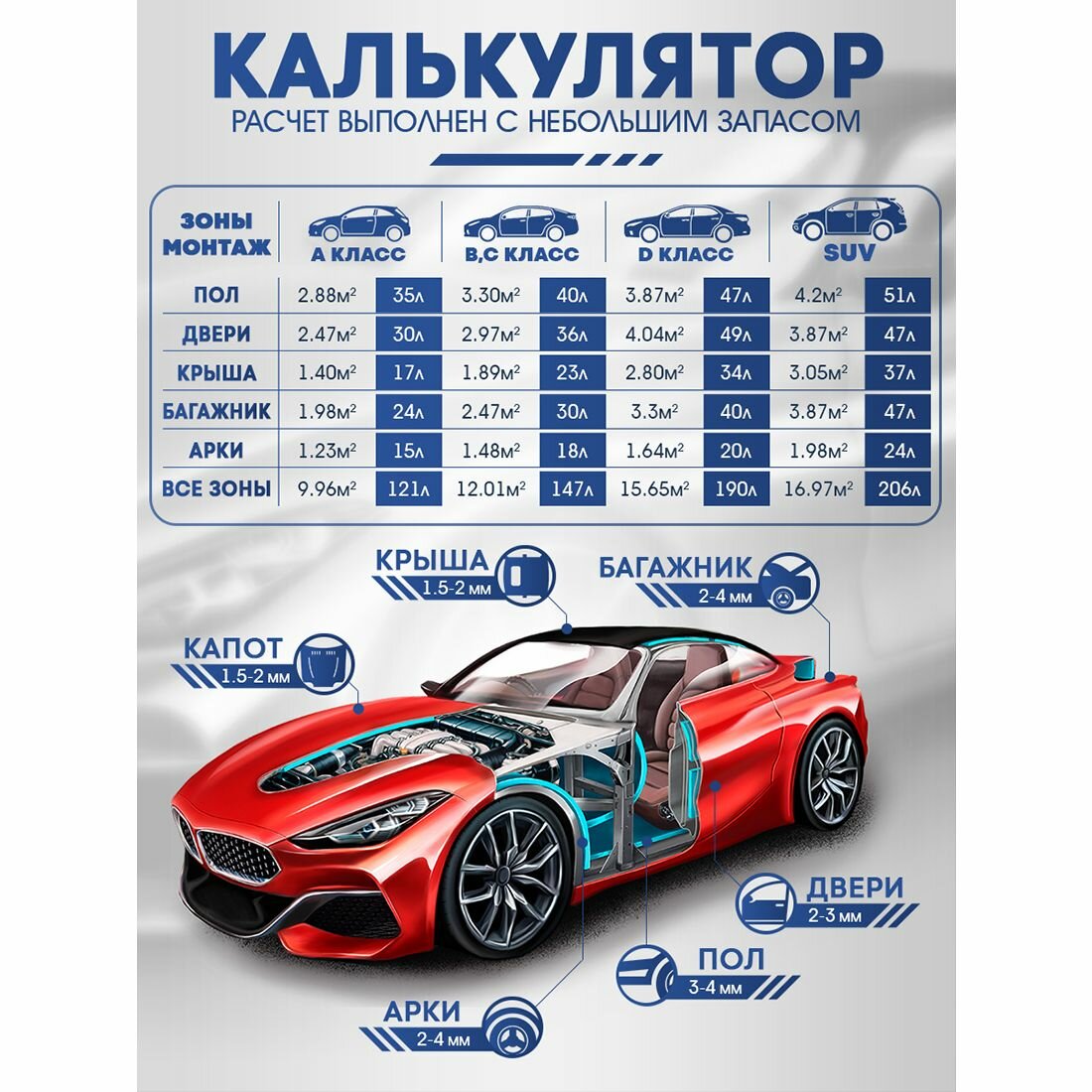 | Место применения | для пола / для капота / для багажника / для дверей / для потолка / для арок |