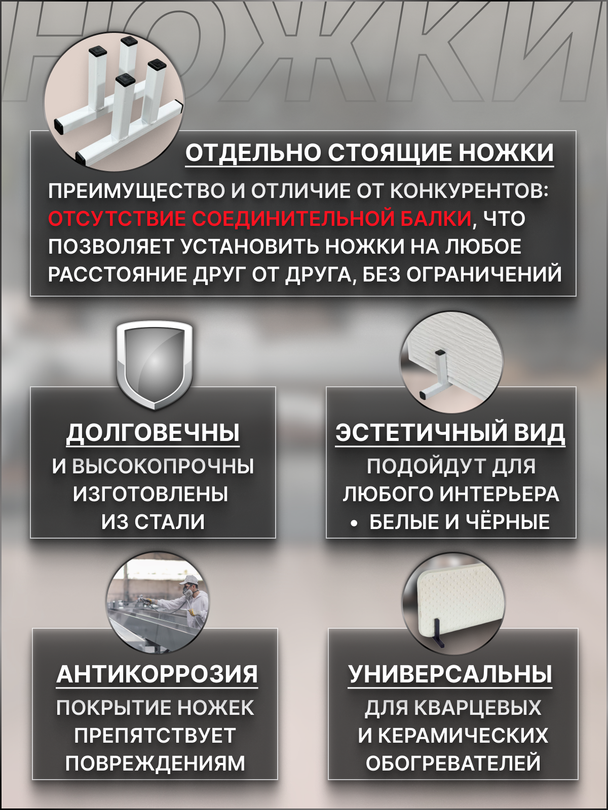 | Подробная комплектация | Ножки для кварцевого обогревателя напольные - 2 штуки |