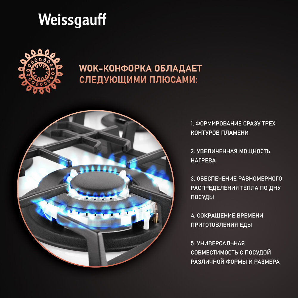 Купить Варочная панель Weissgauff HGG 641 WV WOK-конфорка, 3 года гарантии, автоматический электроподжиг, Рукоятки Hi-Tech, газ-контроль