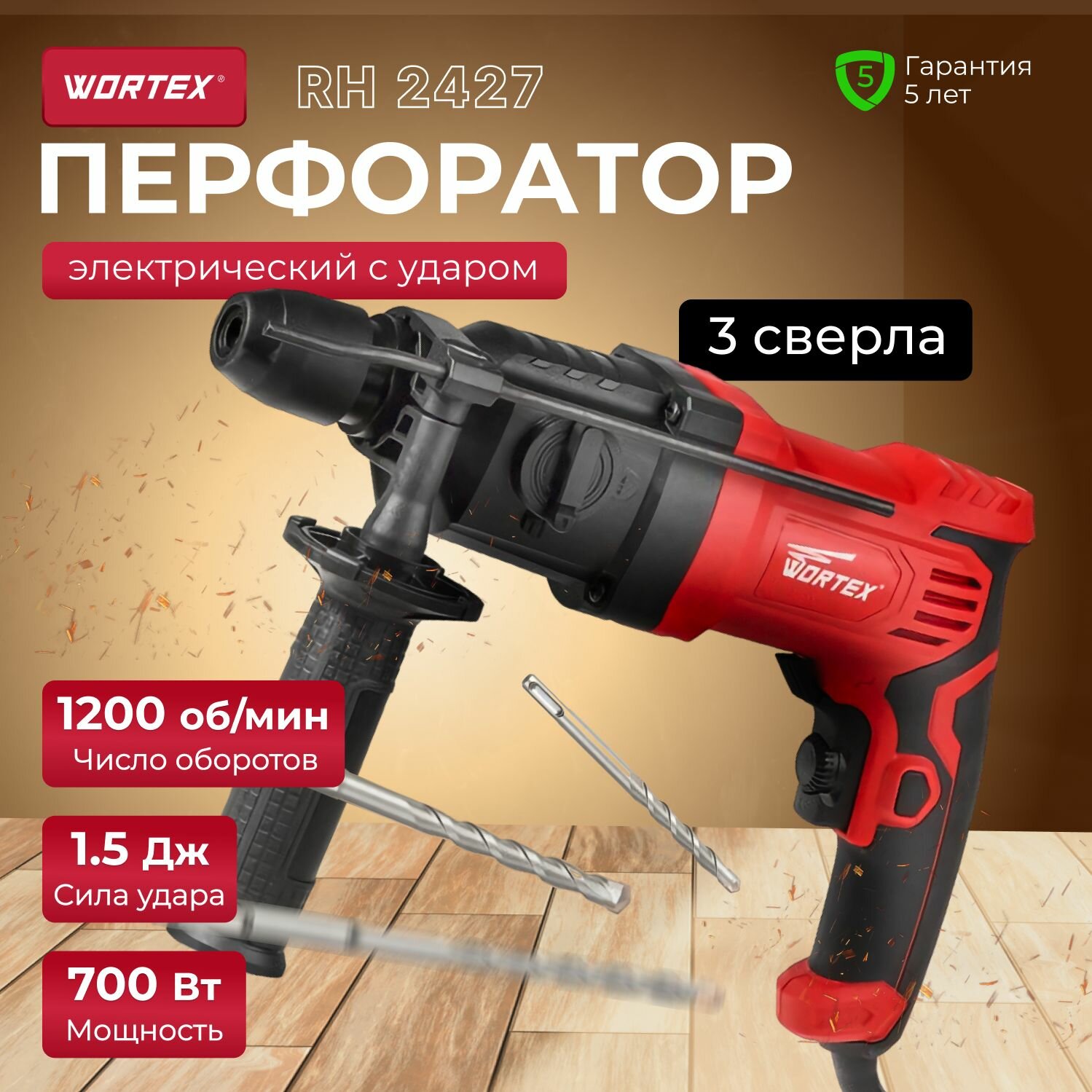 Перфоратор WORTEX RH 2427 в кор. + набор буров (700 Вт, 1.5 Дж, 2 реж., патрон SDS-plus, вес 1.5 кг) (RH242700025)