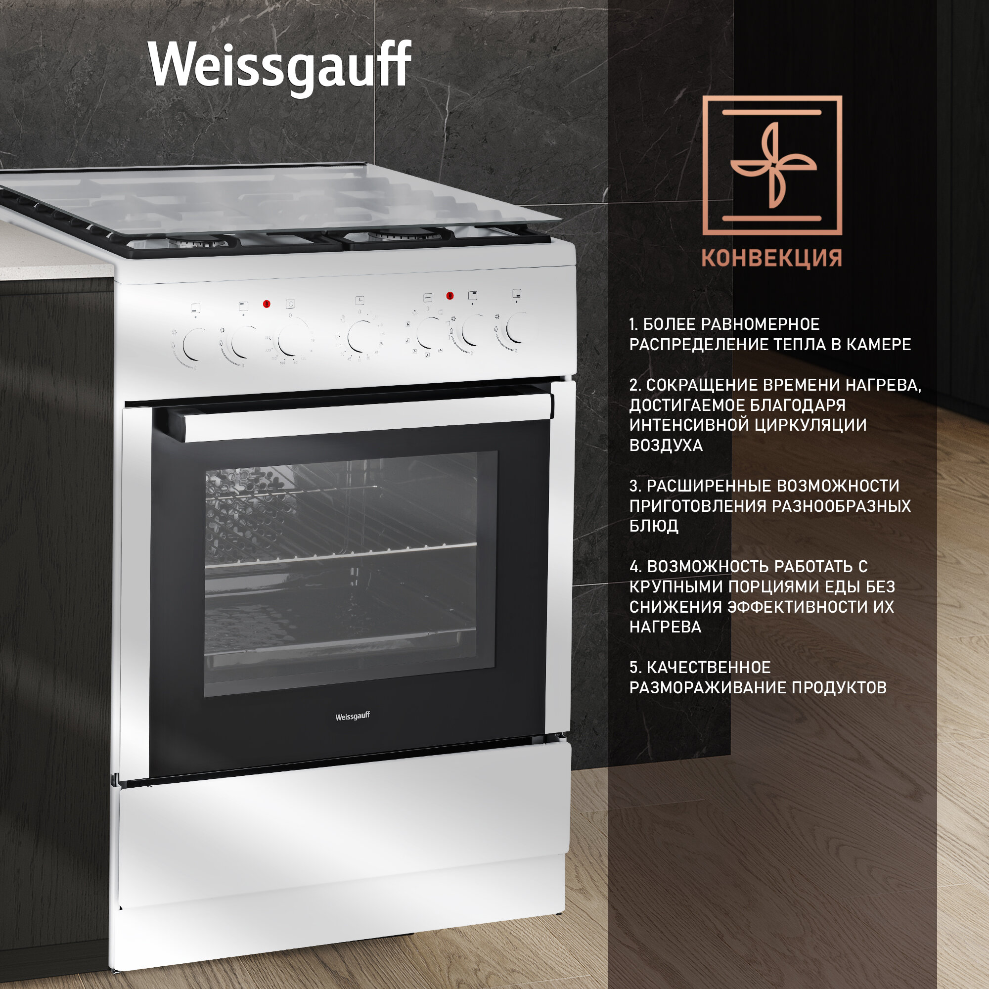 Купить Комбинированная плита Weissgauff WCS K1K62 WGM 3 года гарантии, Объем 50 литров, гриль, Конвекция, Термостат духового шкафа