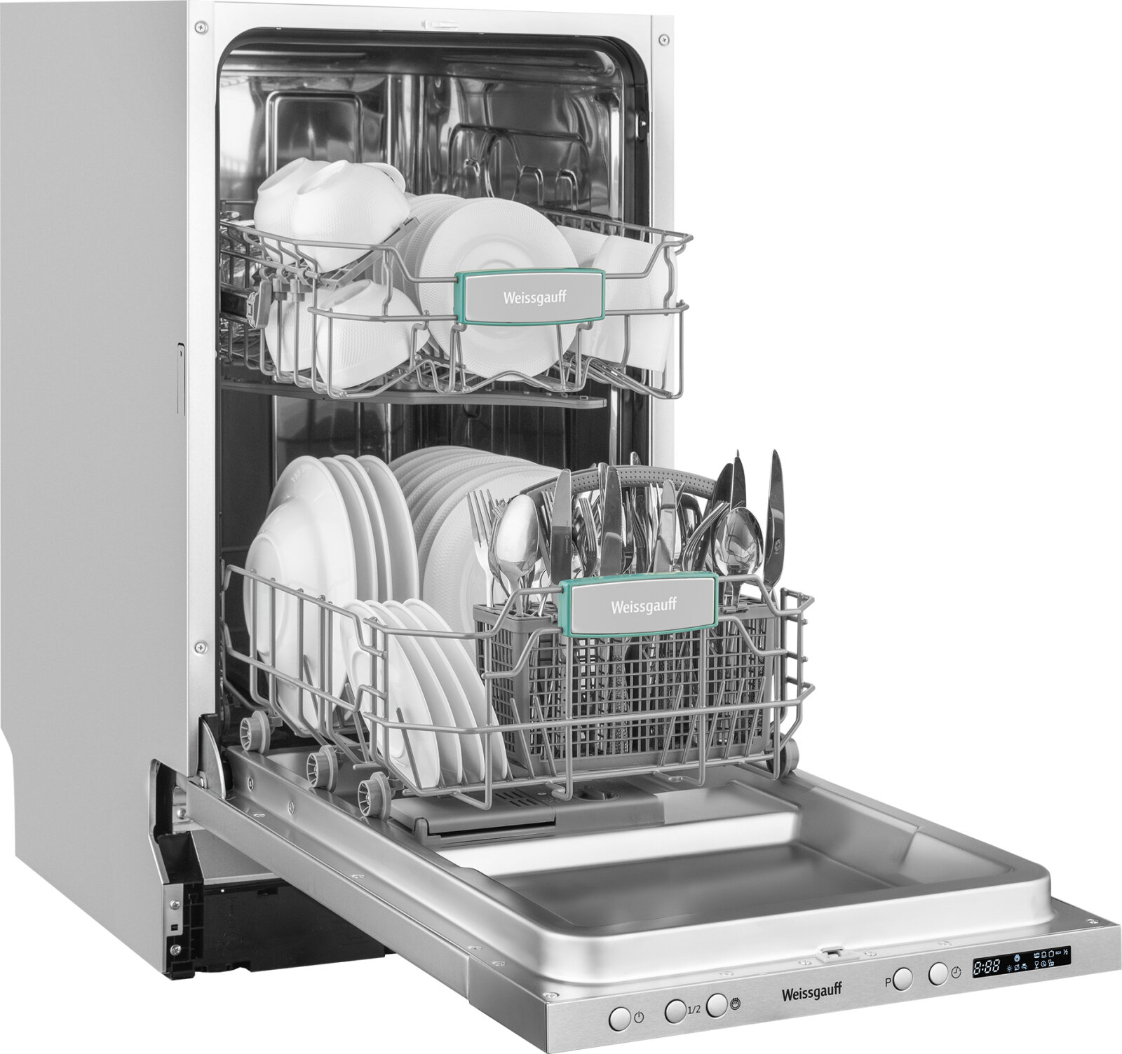 Купили данную машинку по совету знакомых, показалась не вместительной, раньше пользовались Бошш и там две корзины, лоток для столовых приборов, а тут вместо лотка дополнительная секция, в общем итоге три корзины...нужно приловчиться к расположению посуды, взяли в квартиру студию, она реально тихая, корзины выдвигаются по максимуму, моет видимо из-за трёх распылителей, очень хорошо, посуда сухая, открыть/закрыть во время мойки-легко, но есть некоторые моменты, у нас вся посуда больших размеров, тяжеловато разместить, недостаточно высоты и если посуда поместилась, то есть следующий косяк, дверца для таблетки не может открыться из-за высоты посуды,т.к дверца откидывается в верх для освобождения таблетки и конечно же не хватает луча оповестителя,нет половиной загрузки.