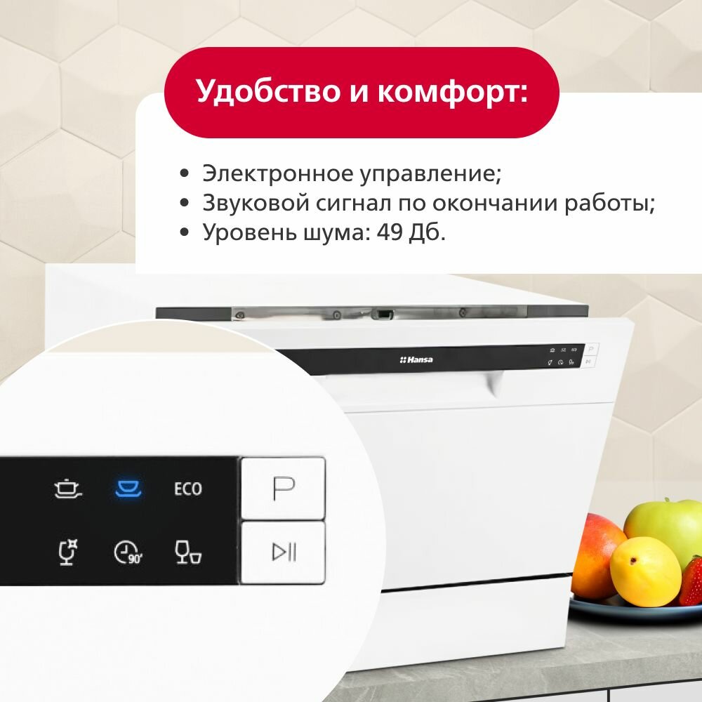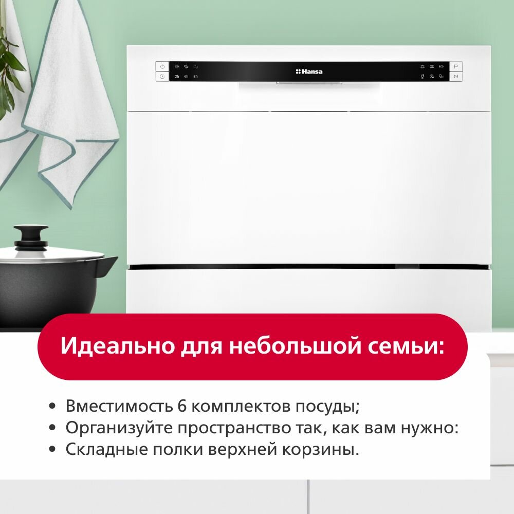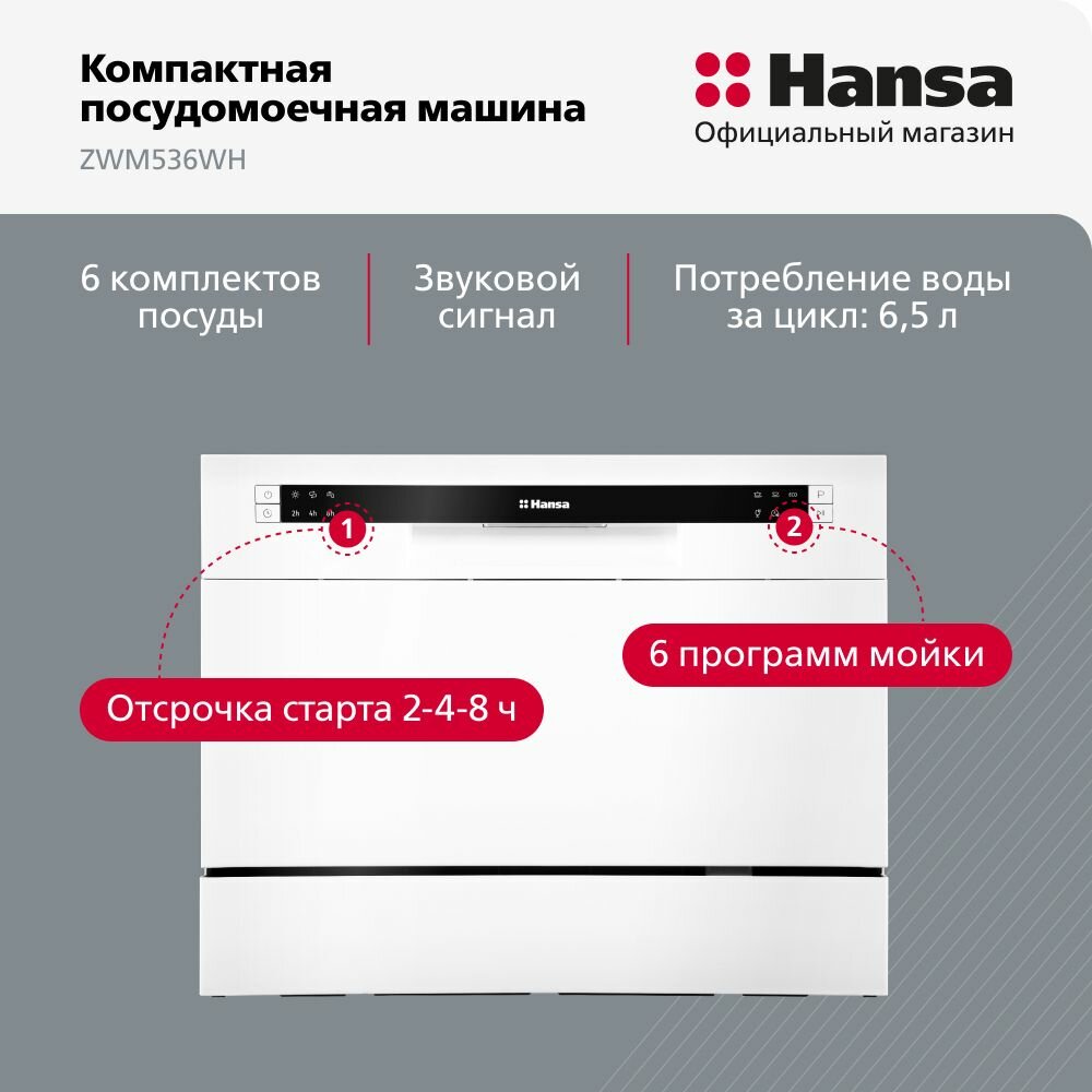 СохранитьПосудомоечная машина настольная Hansa ZWM536WH, 55 см, компактная, 6 программ, 1 корзина, режим быстрой мойки и отсрочки старта, отдельностоящая интересное:
