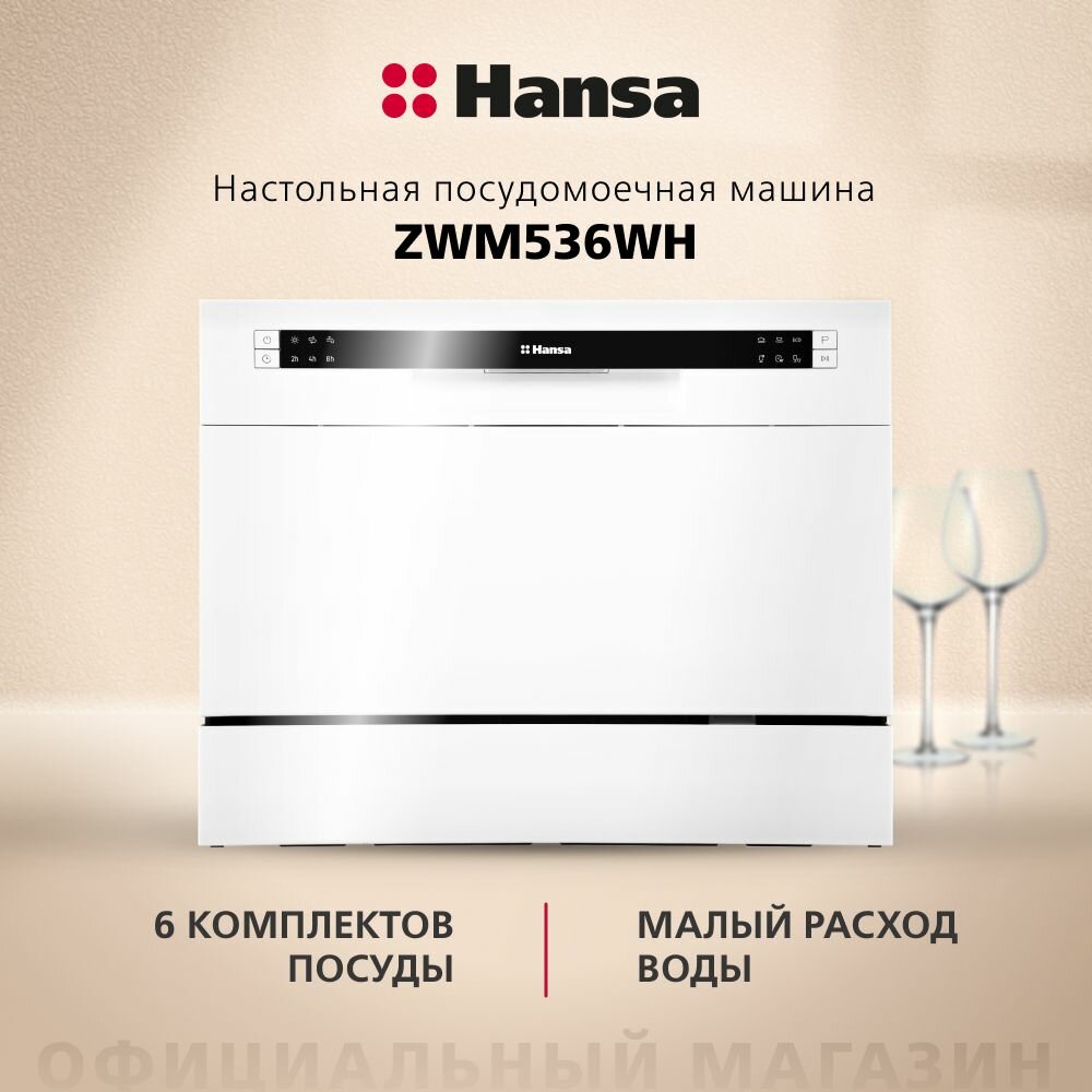 Посудомоечная машина настольная Hansa ZWM536WH, 55 см, компактная, 6 программ, 1 корзина режим быстрой мойки и отсрочки старта, отдельностоящая