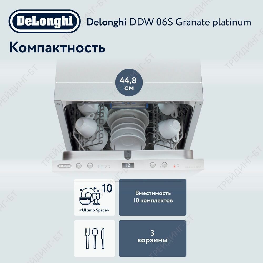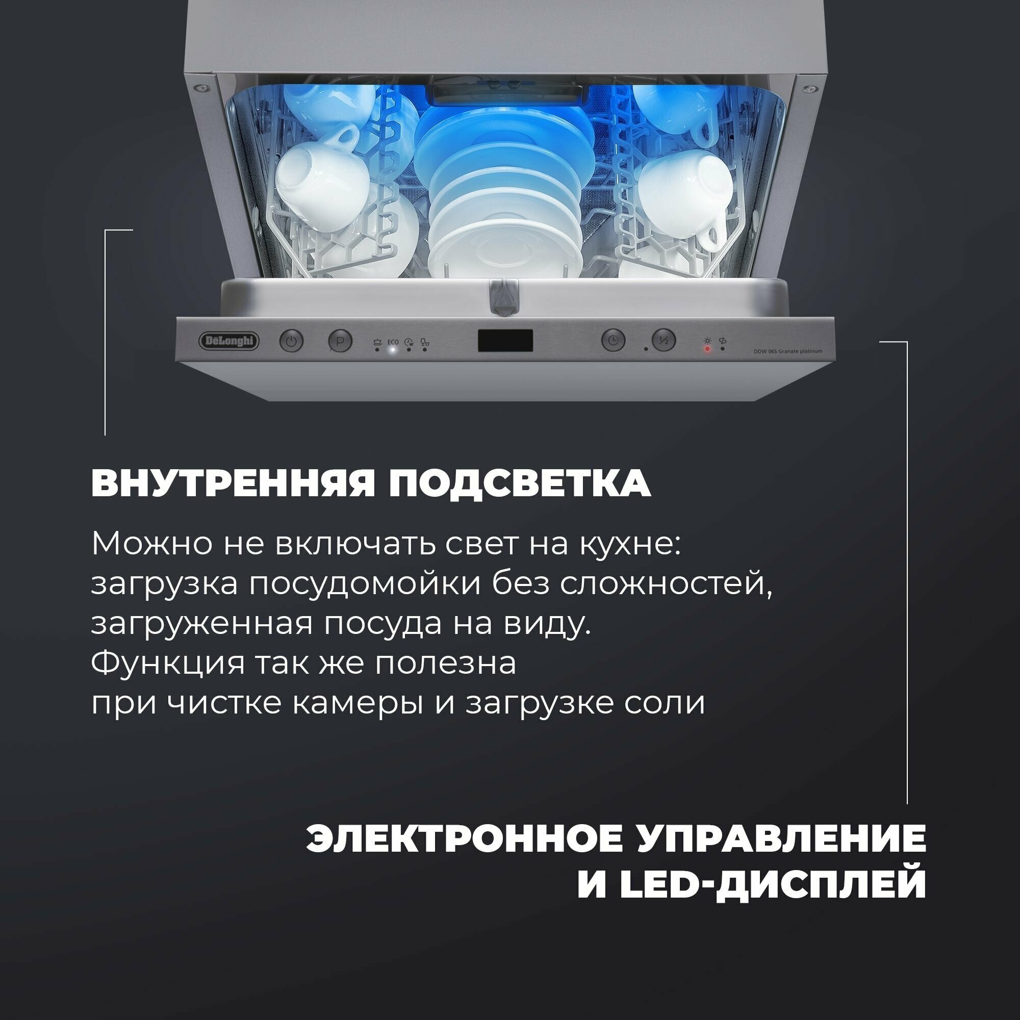 Встраиваемая посудомоечная машина De'Longhi DDW 06S Granate platinum, 45 см, 10 комплектов, Aqua Stop, 3 корзины, внутренняя LED-подсветка