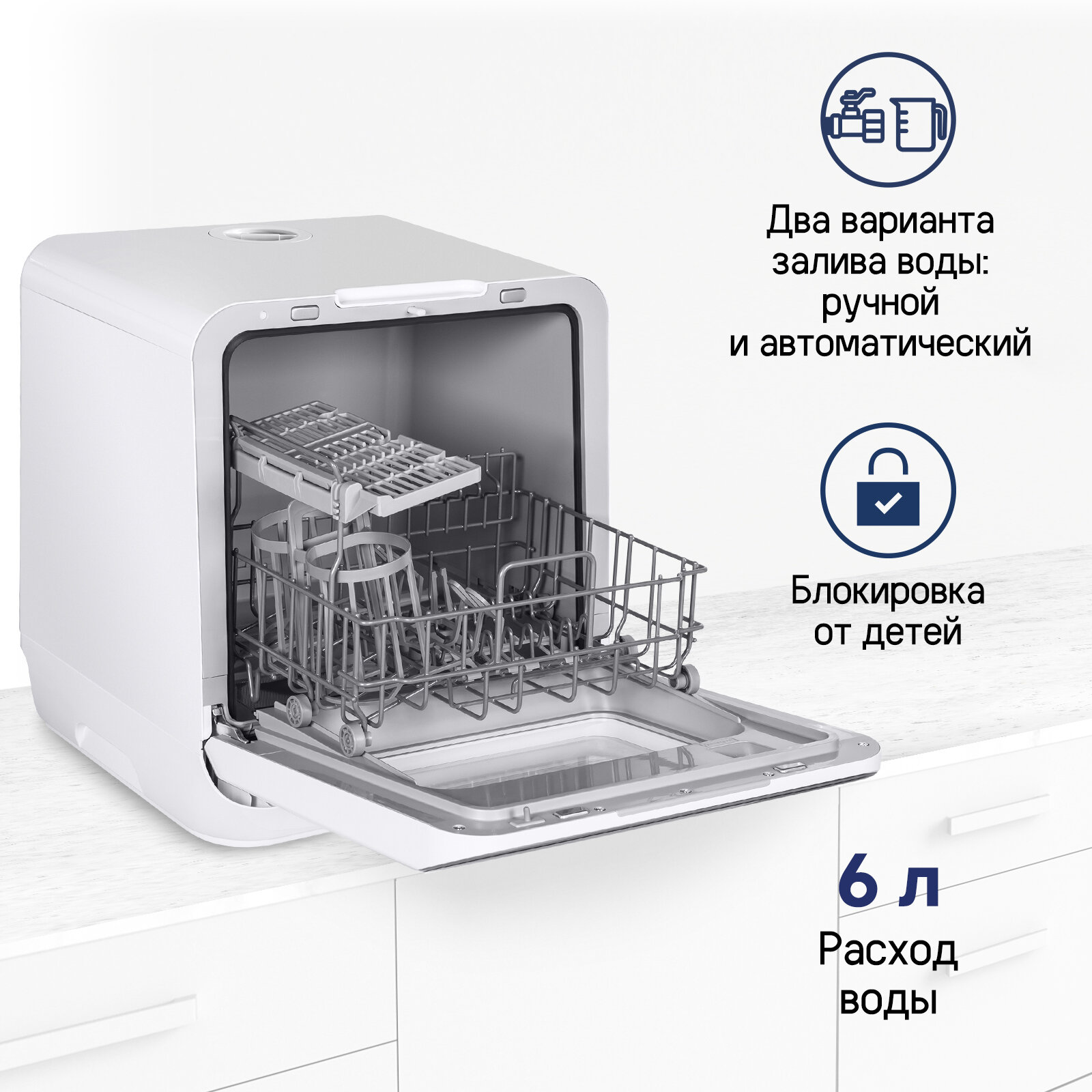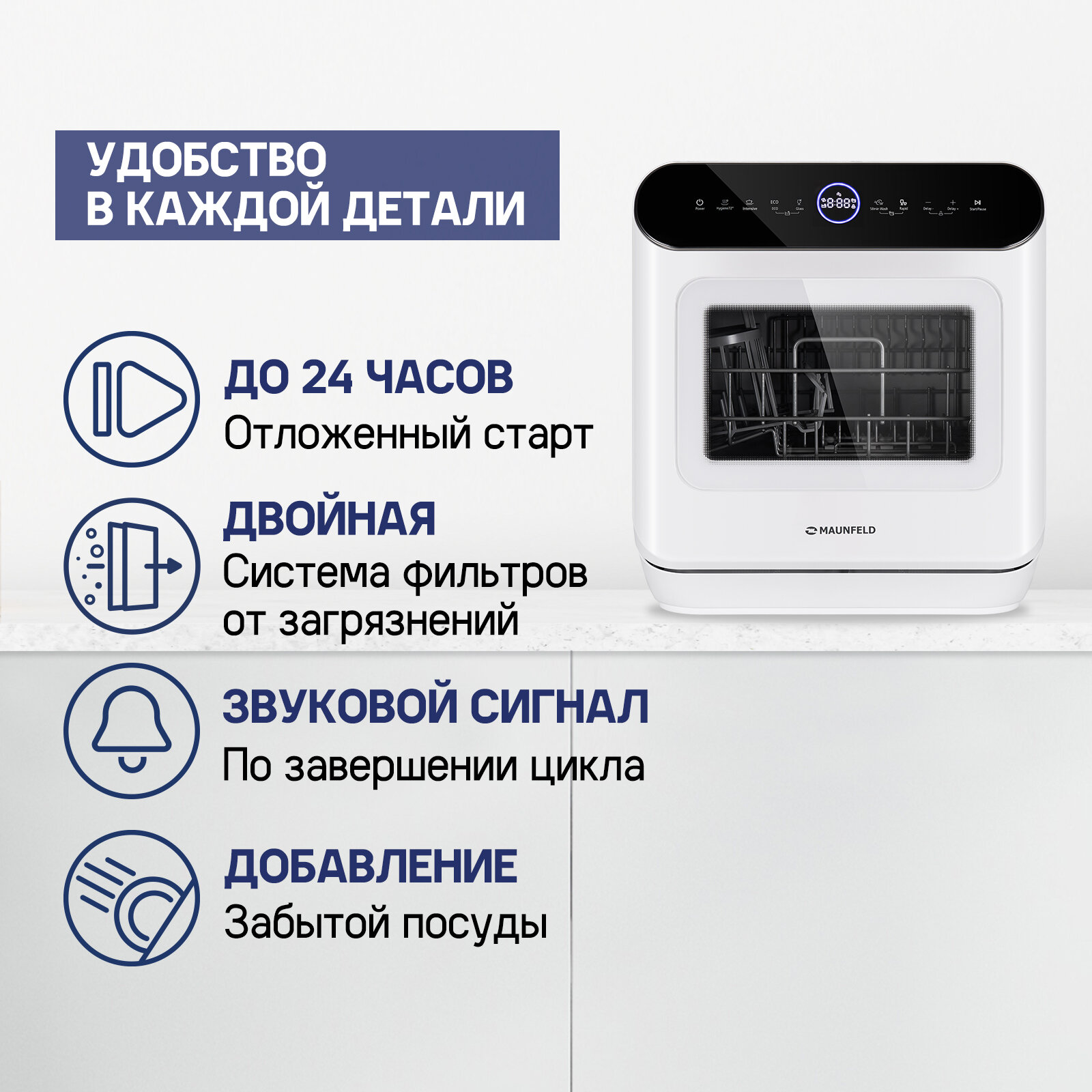 Купить Посудомоечная машина MAUNFELD MWF07IM отдельностоящая компактная 42 см, 3 комплекта, 7 программ, авто-открывание, сенсорное управление, режим быстрой мойки, отсрочка старта, белая