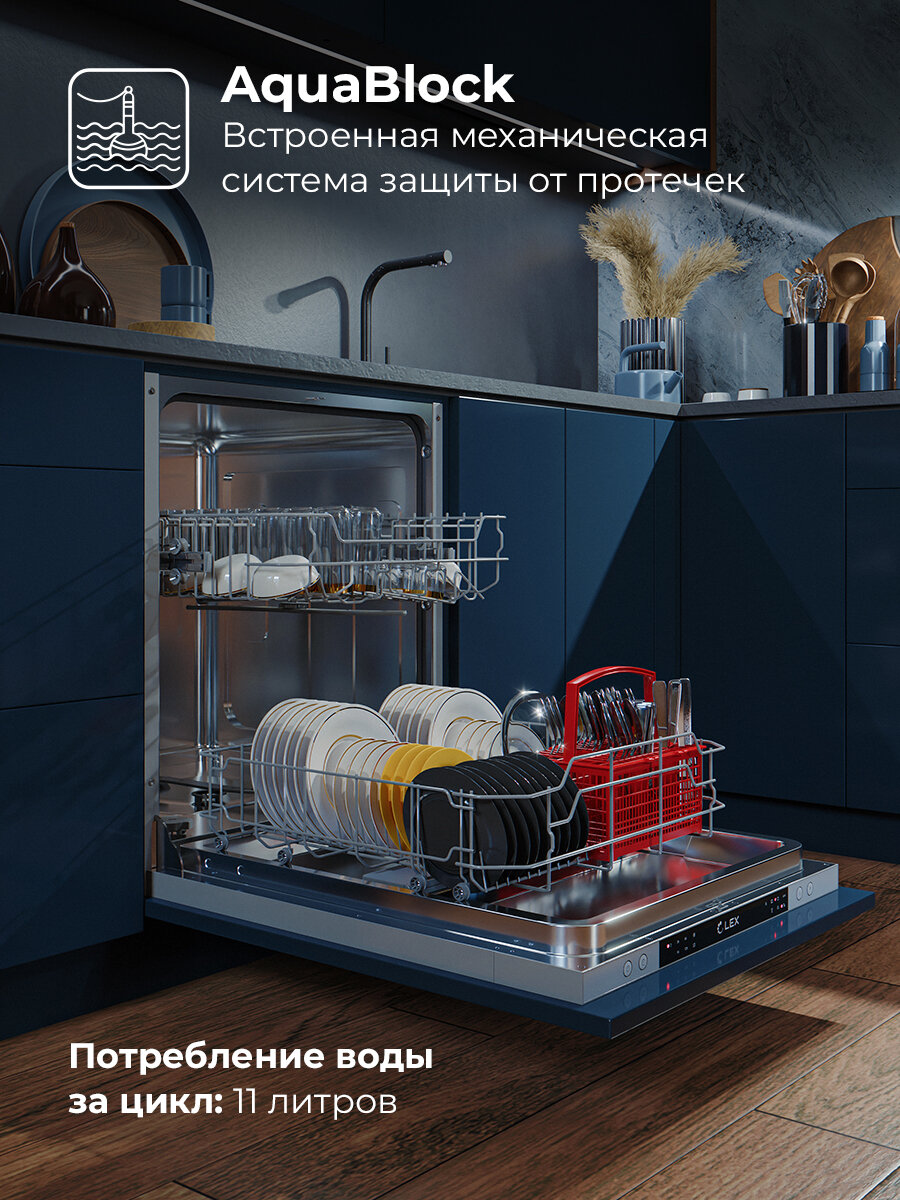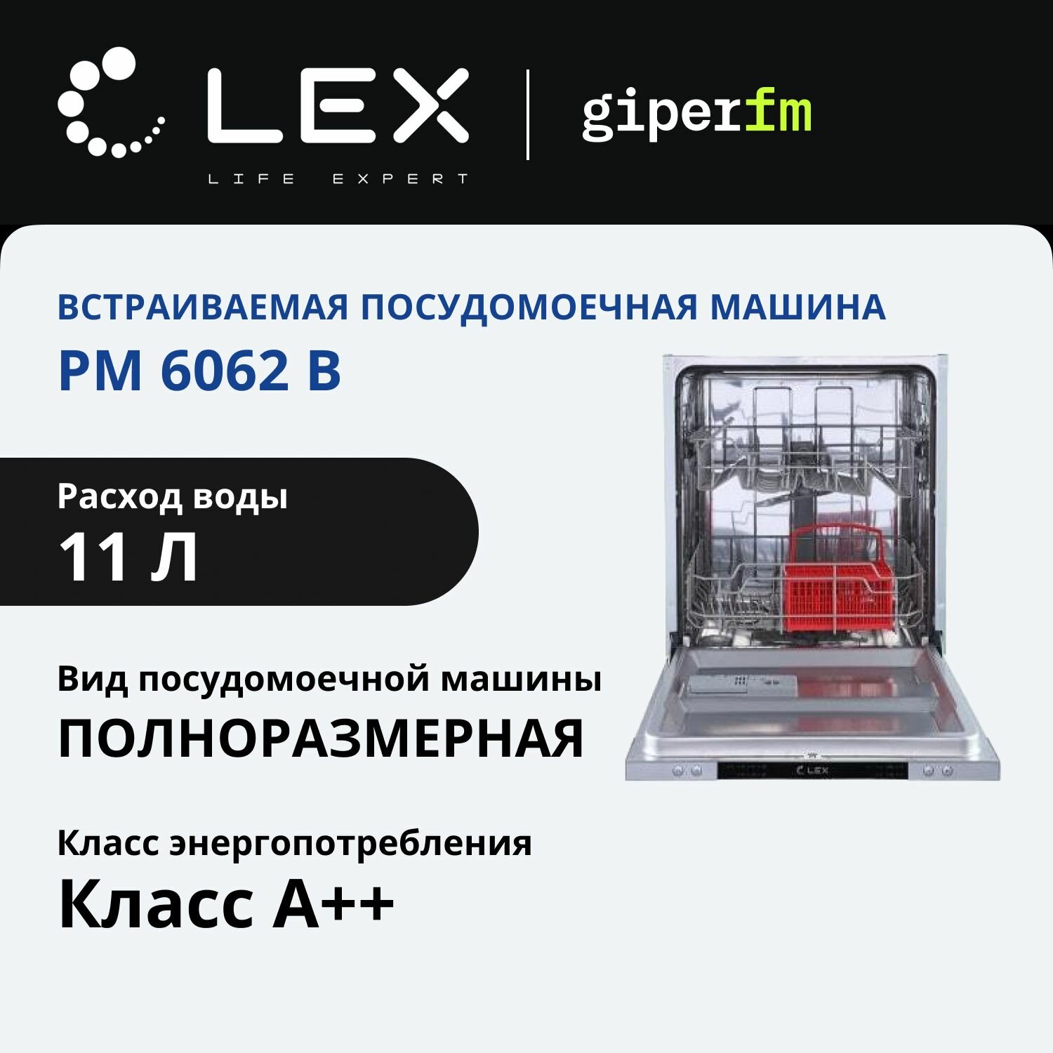 Встраиваемая посудомоечная машина LEX PM 6062 B, полноразмерная, ширина 59.6см, полновстраиваемая, загрузка 12 комплектов