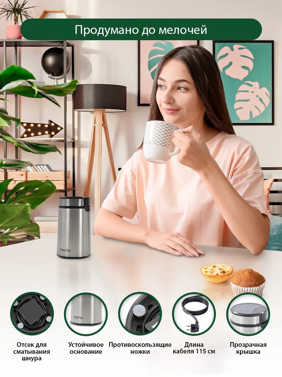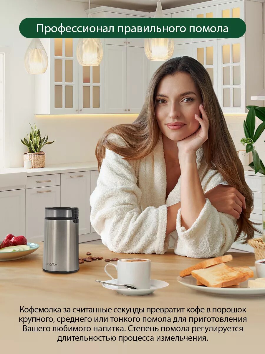 | Отзыв: | Кофемолка MARTA MT-2169 - идеальный выбор для настоящего любителя кофе! Компактная, легкая в использовании и простая в уходе. Молет кофе равномерно, сохраняя все его ароматы. Я в восторге от своей новой покупки, теперь каждое утро н |