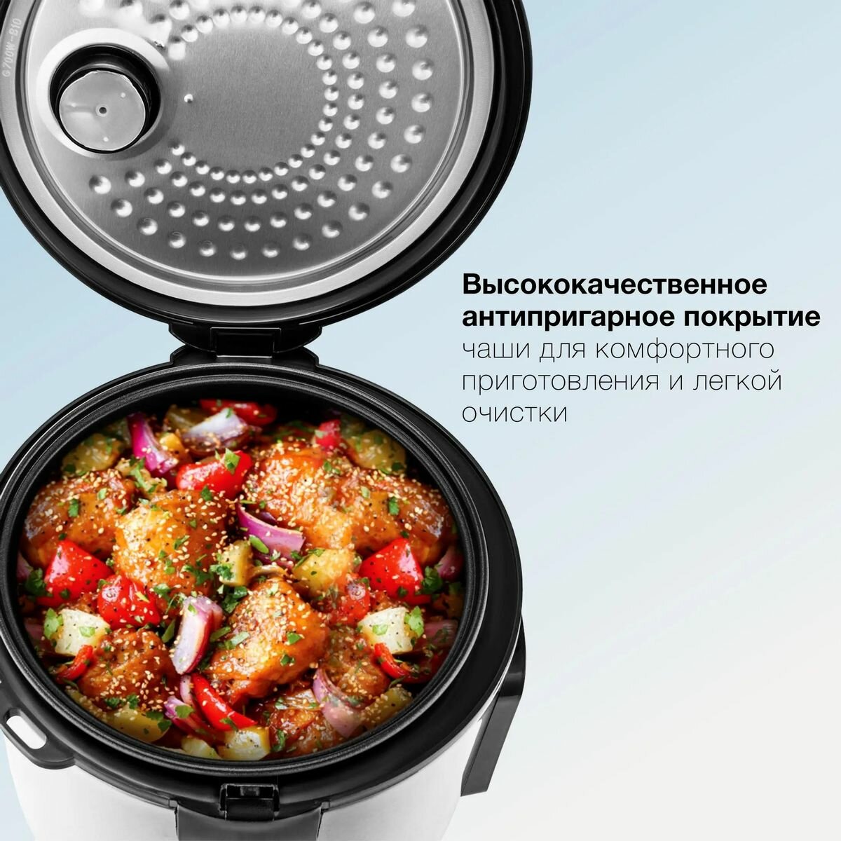 Антипригарное покрытие(ни чего не пригорает и легко моется). 31 программа готовки. |