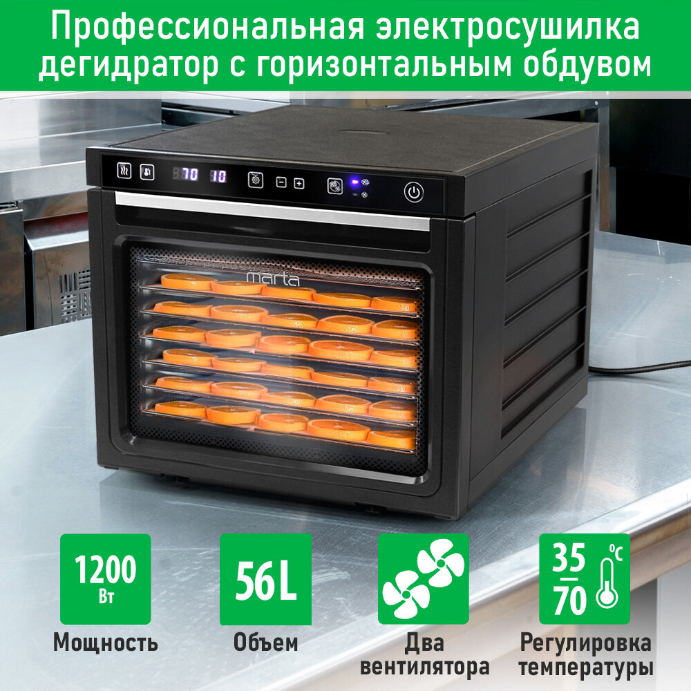 Дегидратор сушилка для овощей электросушилка MARTA MT-FD1891A профессиональная с горизонтальным обдувом 8 поддонов черный